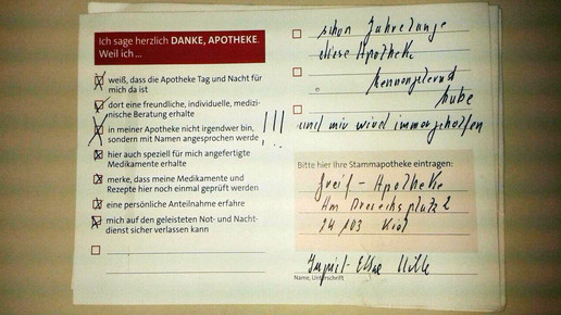 Mehrere Postkarten hatte auch die Greif-Apotheke in Kiel von Kunden erhalten: Eine Kundin bedankte sich etwa für die „Geduld mit mir“ und die Hilfsbereitschaft. Ein anderer Patient verwies auf die „freie Lieferung per Zimmertür im Altenheim“. Eine weitere Patientin freute sich darüber, in der Apotheke immer mit dem Namen persönlich angesprochen zu werden und ihre werde dort „immer geholfen“.