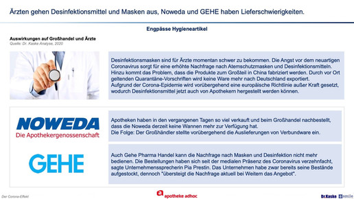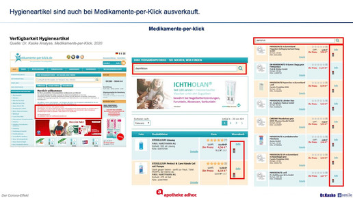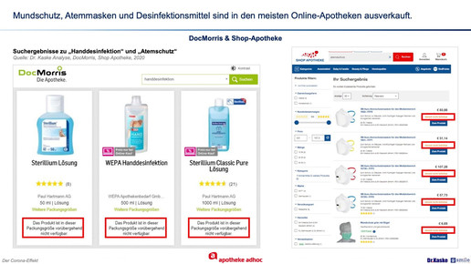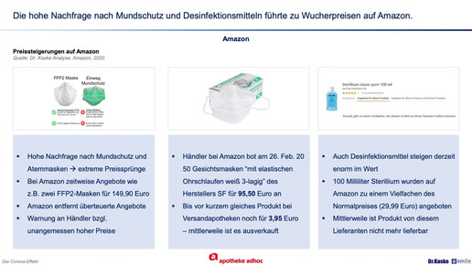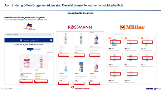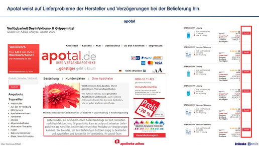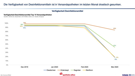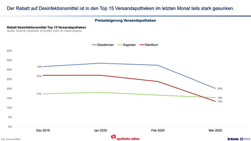 Doch auch normale Versandapotheken wollen an dem Run auf die Produkte mitverdienen: So sind die Rabatte auf Desinfektionsmittel bei den Top 15 Versandapotheken deutlich gekürzt worden: Bei Desderman von durchschnittlich 32 auf 20 Prozent, bei Sterillium sogar von 27 auf 13 Prozent. Dr. Das Phänomen gibt es allerdings auch vor Ort: Eine Apothekerin aus NRW hatte jetzt Ärger, weil sie Desinfektionsmittel zu deutlich erhöhten Preisen verkauft hat, auch von Kollegen hagelte es Kritik.