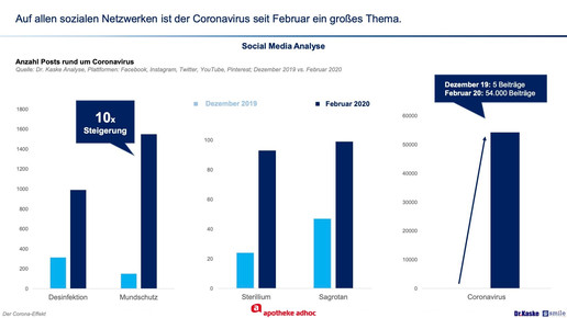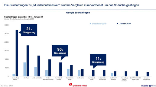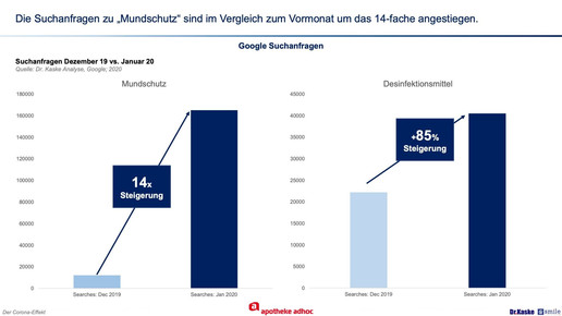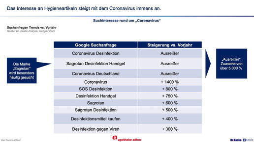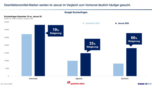 Die hohe Aufmerksamkeit für das Thema spiegelt sich in den Google-Suchanfragen. Diese sind etwa zu Desinfektionsmitteln von Dezember 2019 bis Januar 2020 um 85 Prozent gestiegen. „Mundschutzmasken“ wurden im Januar im Vergleich zum Vormonat 90-fach öfter gegoogelt. Auch einzelne Produkte wie Sterillium (+66 Prozent), Sagrotan (+33 Prozent) oder Ocentisept (+19 Prozent) werden im Monatsvergleich signifikant öfter gesucht.
