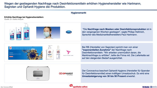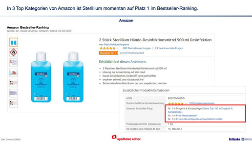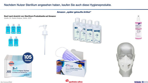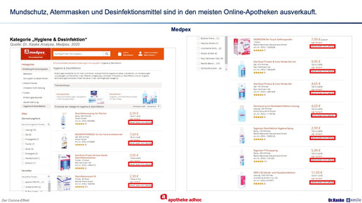 Bei der Analyse der Preisentwicklung, ist dem Team von Dr. Kaske neben der massiven Steigerung noch etwas anderes aufgefallen: 90 Prozent der Suchergebnisse zu „Händedesinfektion“ sind gar keine entsprechenden Produkte, sondern Anleitungen und Hinweisschilder zum richtigen Händewaschen. Im Beispiel: 14,99 Euro, Lieferung frei Haus.