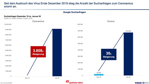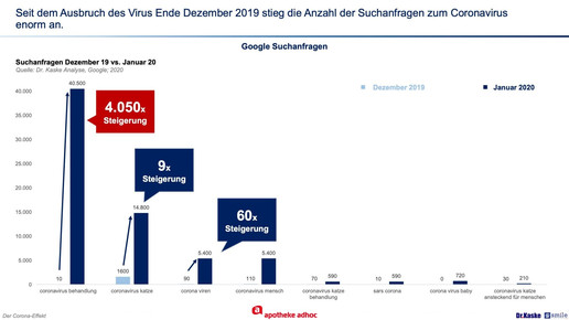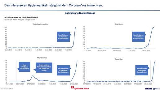 Versandapotheken erhöhen bei Desinfektionsmitteln die Preise und bei Amazon ist Sterillium auf Platz 1 im Bestseller-Ranking. Die Marketing-Agentur Dr. Kaske hat exklusiv für APOTHEKE ADHOC den „Corona-Effekt“ unter die Lupe genommen. Die Analyse der Google-Anfragen zeigt deutlich, zu welchem Zeitpunkt verschiedene Themen beherrschend wurden. Alle Ergebnisse in der Galerie.