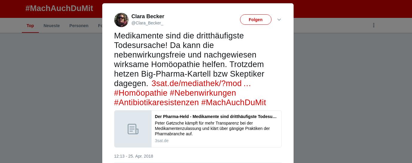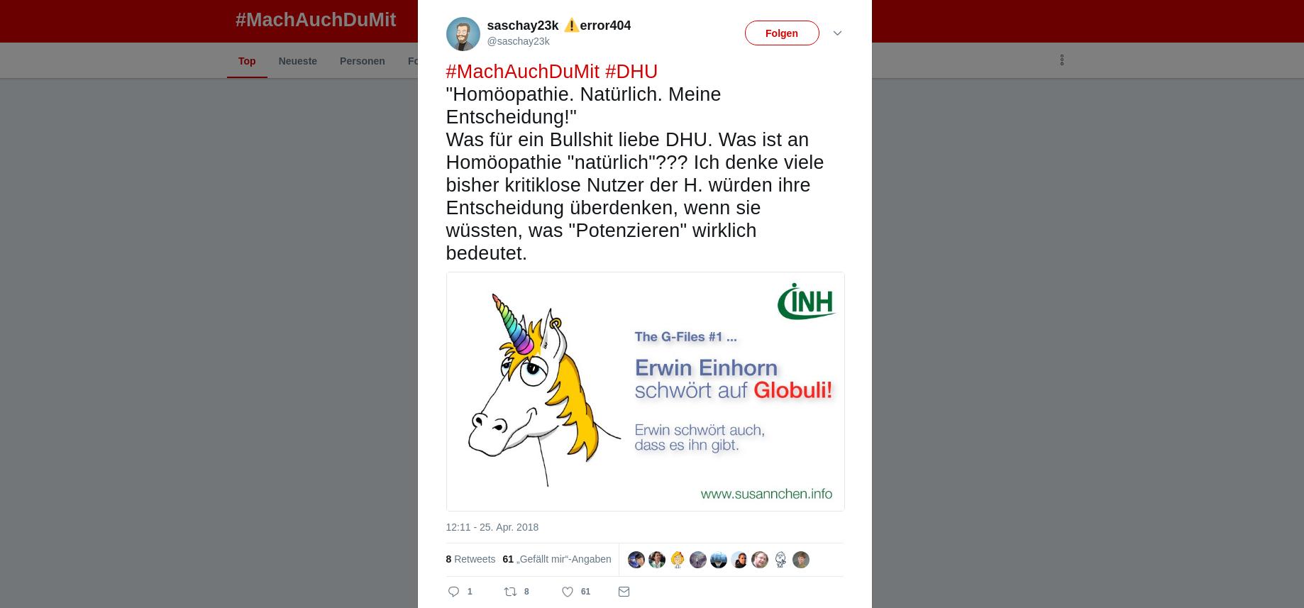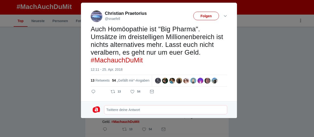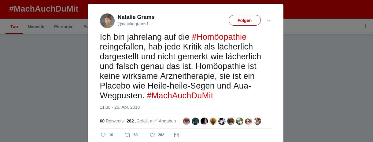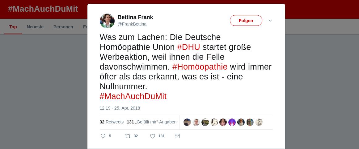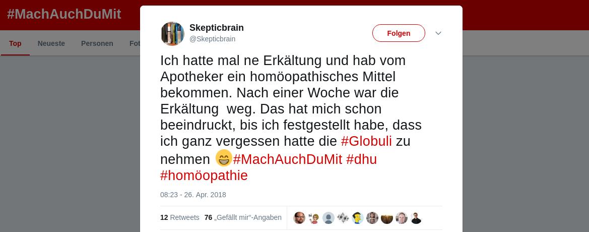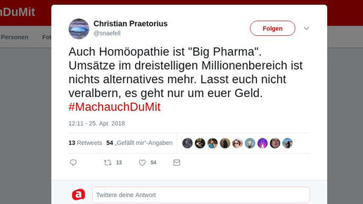 Erfahrungsberichte gab es auch, allerdings vermutlich etwas anders, als man sich das in Karlsruhe vorgestellt hat: „Ich bin jahrelang auf die Homöopathie reingefallen, hab jede Kritik als lächerlich dargestellt und nicht gemerkt, wie lächerlich und falsch genau das ist. Homöopathie ist keine wirksame Arzneitherapie, sie ist ein Placebo wie Heile-heile-Segen und Aua-Wegpusten.“ Ein anderer Nutzer erzählt: „Eine liebe Freunde war mit einem hartnäckigen Husten beim Unheilpraktiker, der ihr Glaubuli empfohlen hat. 'Ne Woche später lag sie mit Lungenentzündung stationär im Krankenhaus. Komm schon, #DHU: #MachAuchDuMit!“