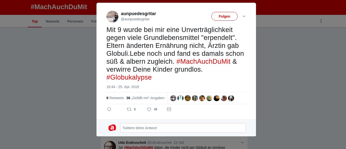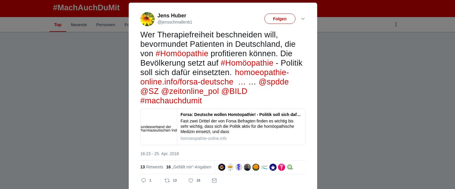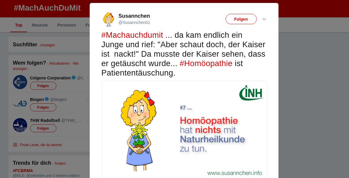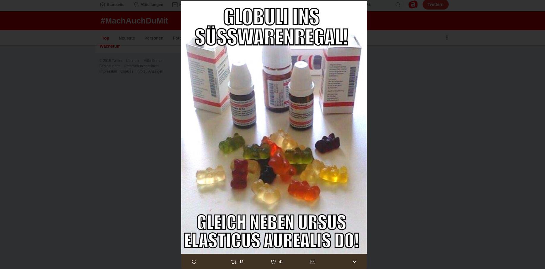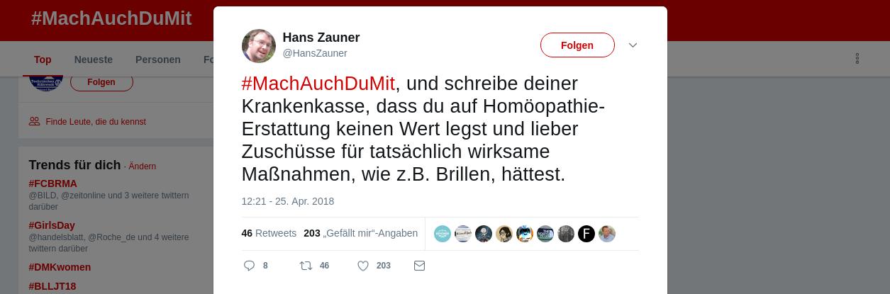 „#MachAuchDuMit und schreibe deiner Krankenkasse, dass du auf Homöopathie-Erstattung keinen Wert legst und lieber Zuschüsse für tatsächlich wirksame Maßnahmen, wie z. B. Brillen, hättest“, schreibt ein Nutzer. Ein anderer schlägt vor: „#MachAuchDuMit - #Globuli ins Süßwarenregal!“