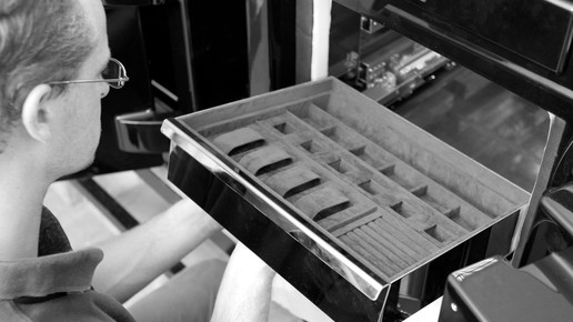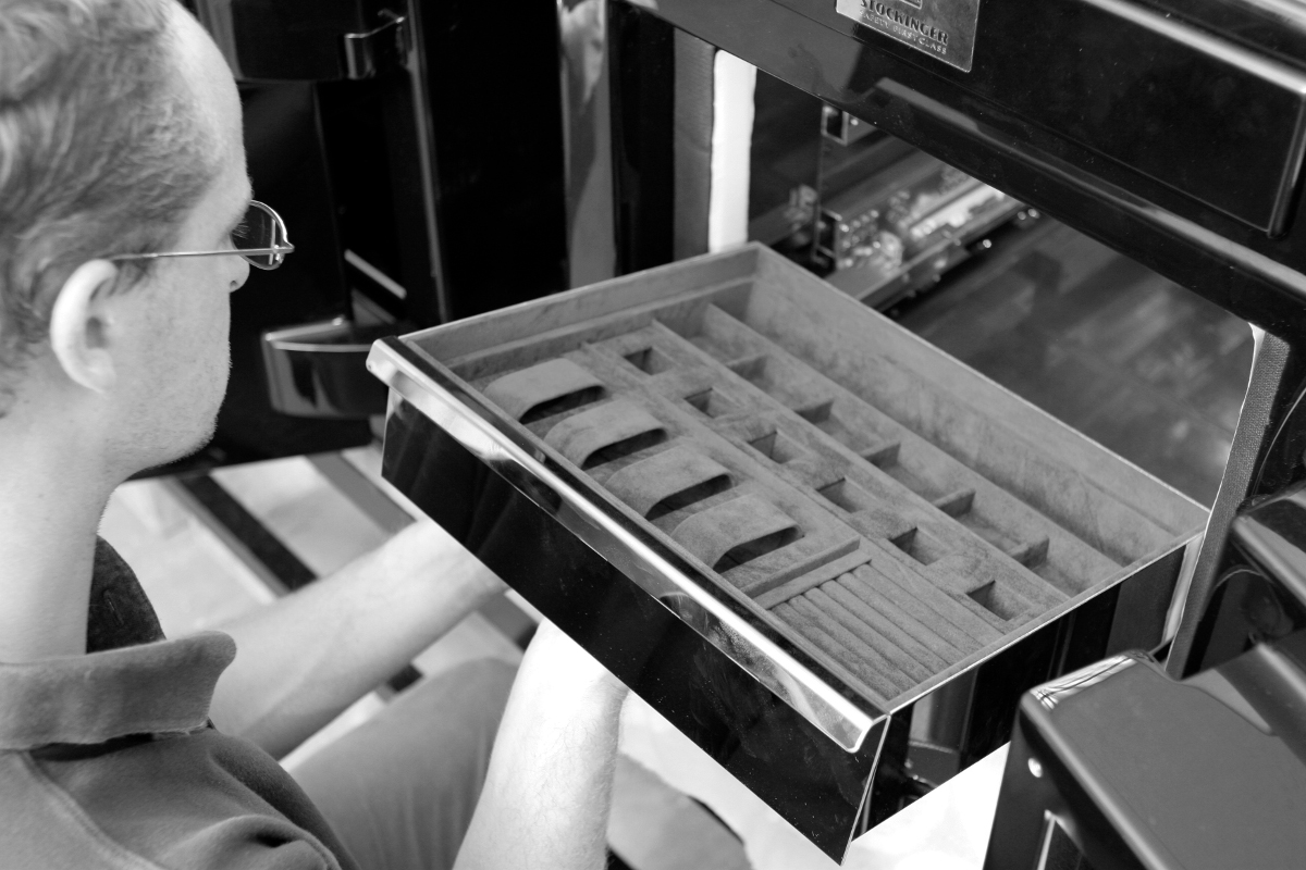 „Sehr oft lackieren wir Safes exakt in der Farbe des Lieblings-Fahrzeuges, etwa Aston Martin, Porsche oder Rolls-Royce und statten das Interieur der Safes in den Materialien Holz, Leder und Alu des Wagens aus.“ Das Leder des Safes bekommt dann selbstverständlich dasselbe Nahtmuster wie das Auto, soll ja alles zusammenpassen.