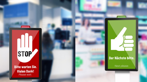 Wartenden Kunden können über die Stele beispielsweise Informationen zu Serviceleistungen und Aktionen der Apotheke vermittelt werden. Die Inhalte können vom HV-Tisch aus oder über mobile Endgeräte gesteuert werden. So soll das Team auch den Kundenfluss besser regulieren können.
