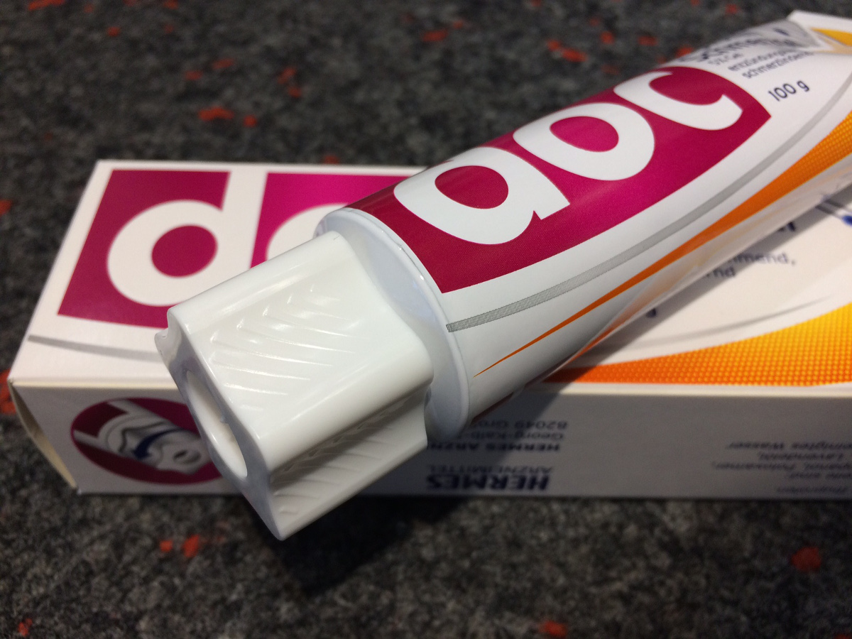 Das Öffnen oder Verschließen von Arzneimitteltuben kann mitunter eine Herausforderung sein. Ein ergonomischer Griff kann Abhilfe schaffen. GlaxoSmithKline (GSK) liefert Voltaren-Schmerzgel (Diclofenac) zu 150 g seit 2010 mit einem dreiflügligen Komfortverschluss, dieser soll beispielsweise Arthrose-Patienten das Öffnen der Tube erleichtern. Nun zieht Hermes nach und liefert Doc Schmerzgel mit einem ergonomischen Verschluss aus. Auch andere Hersteller lassen sich etwas einfallen.