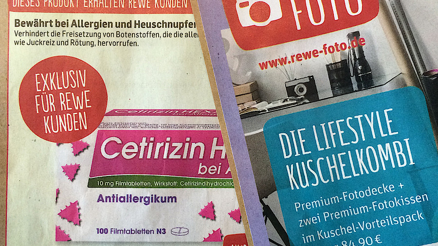 Rewe und DocMorris kooperieren seit 2012. Zwar gab es in den Supermärkten nie Pick-up-Stellen der Versandapotheke, dafür stehen aber die DocMorris-Eigenmarken in den Rewe-Regalen. Im Ausgangsbereich liegen Prospekte der Versandapotheke mit Angeboten „exklusiv für Rewe-Kunden“. Bereits vor zwei Jahren warb der Supermarkt für die Sonderrabatte bei Cetirizin Hexal – für 15,49 Euro pro Packung à 100 Filmtabletten. Die Packung war damals im Onlineshop günstiger zu haben.
