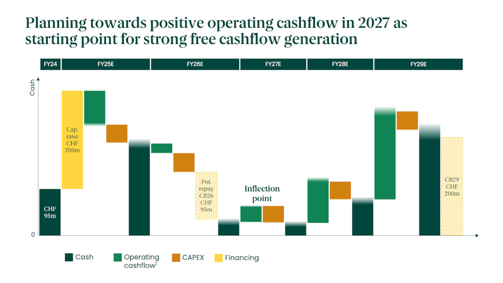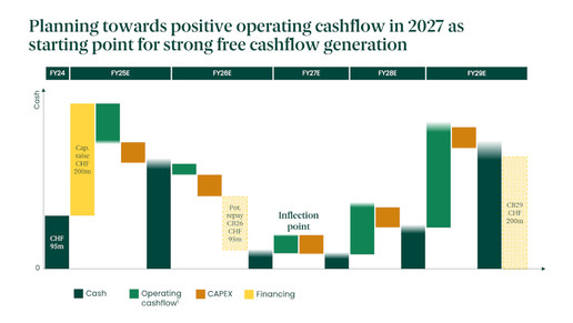 Aber selbst bei den 222 Aktionären, die nicht den Stimmrechtsvertreter beauftragt hatten, sondern ins Marriott-Hotel in Zürich gekommen waren, könnte eine Folie für eine eiskalte Einsicht gesorgt haben: Anhand einer Kurve wollte Wüest eigentlich zeigen, dass es ab 2027 mit dem Cashflow nach oben gehen würde. Was man anhand der Balken aber auch sofort ablesen konnte, ohne dass es der Finanzvorstand ansprechen musste: Ohne Kapitalerhöhung wären bei DocMorris in diesem, spätestens aber im kommenden Jahr wohl die Lichter ausgegangen.