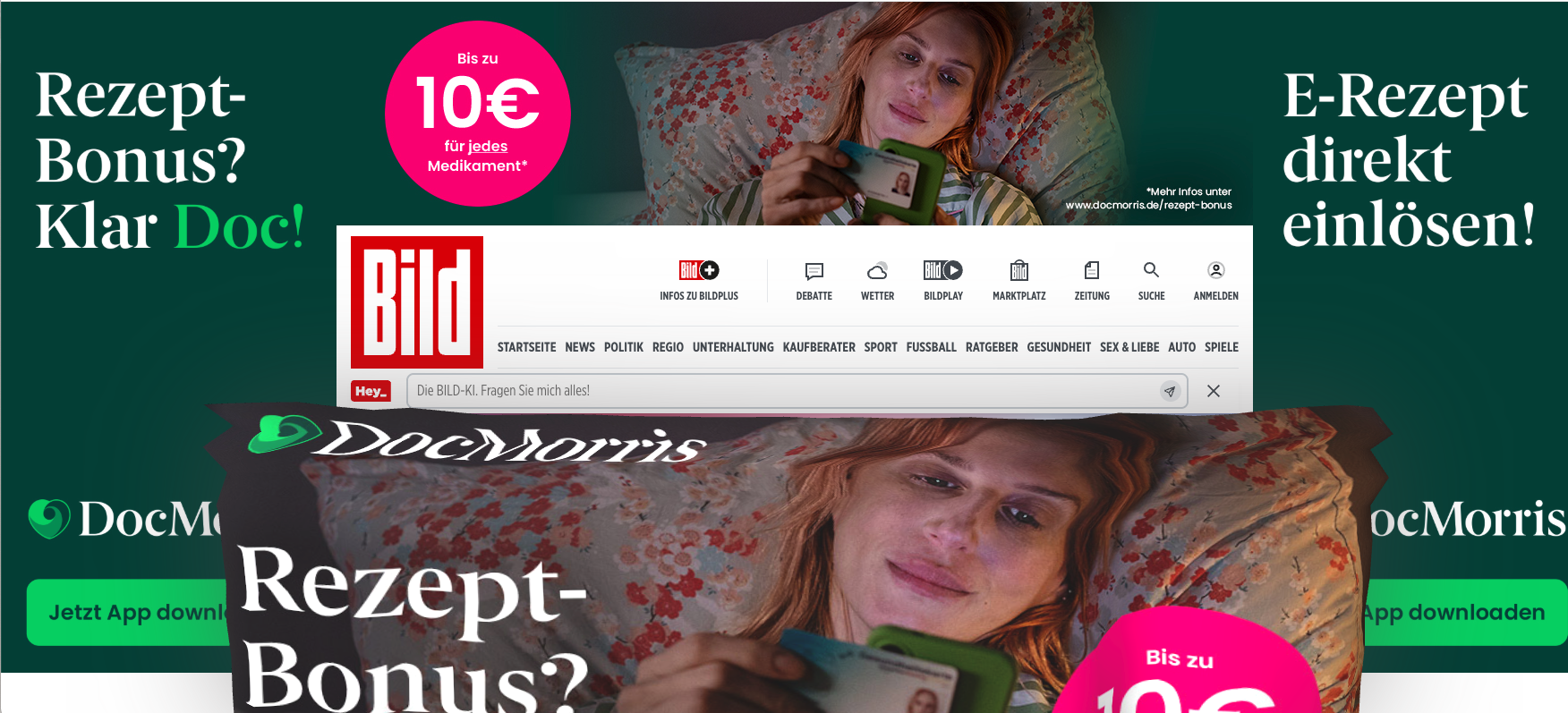 Jetzt folgt der nächste Schritt in der Marketing-Kampagne. Auf Bild.de sind aktuell großflächige Werbebanner des Unternehmens zu sehen. Sowohl ganz oben sowie an den Seiten wird im DocMorris-Grün der Rezept-Bonus beworben: „Klar Doc!“, heißt es dort etwa. „E-Rezept direkt einlösen!“ Abgebildet ist eine Frau, die auf einem Kissen liegt und ihre elektronische Gesundheitskarte (eGK) an ihr Smartphone hält. Zudem wird darauf hingewiesen, dass es „bis zu 10 Euro für jedes Medikament“ geben könne.