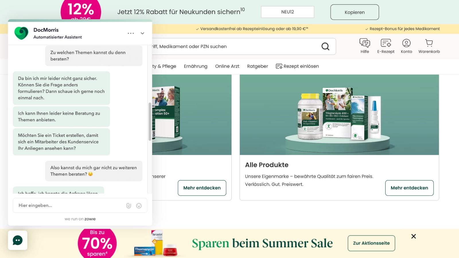 Gut, vielleicht war das zu schwer. Bei klassischen Versenderfragen müsste Morris doch fit sein. „Ich bekomme wirklich für jedes Medikament 10 Euro?“ Zu riskant, findet der Assistent. Er könne die Frage nicht beantworten, „da ich keine pharmazeutische Beratung geben darf. Soll ich ein Ticket für Sie erstellen?“ Ein wenig aufdringlich – und außerdem keine pharmazeutische Frage.