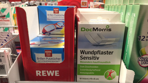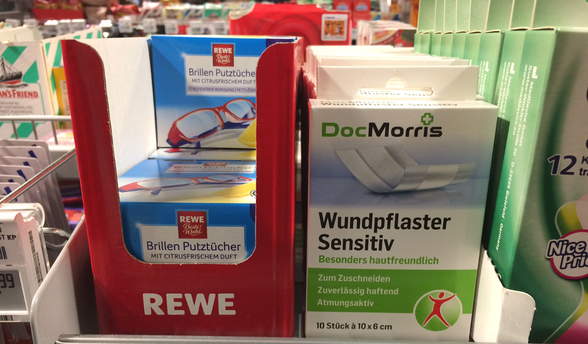 Zwischen dem Super-Dino mit den veganen Einhorn-Kondomen und den Rewe-Brillenputztüchern steht der Aufsteller mit den „DocMorris Wundpflastern sensitiv“ für nur 89 Cent. Im Online-Shop können außerdem das Wundpflaster Classic und die Strips bestellt werden. 59 Cent müssen Kunden für die Salbeibonbons mit Vitamin C vom niederländischen Versender zahlen. Die Eigenmarken sind in mehr als 3000 Märkten erhältlich.