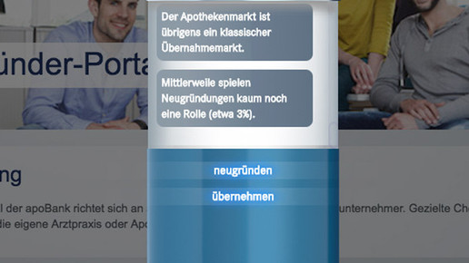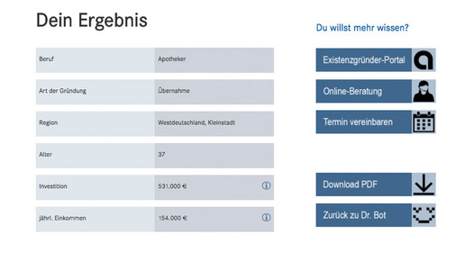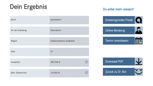 Dr. Bot ist eine Art Existenzgründungsrechner, von denen es für andere Fragestellungen im Internet zahlreiche Varianten zu finden gibt. Ärzte oder Apotheker können recherchieren, ob sich eine Existenzgründung oder Übernahme von Praxen oder Apotheken lohnt: Auf einer Deutschlandkarte kann man eine Region anklicken, sein Alter und Geschlecht eingeben, und schon erhält man überraschend positive Informationen zu seinen Absichten.