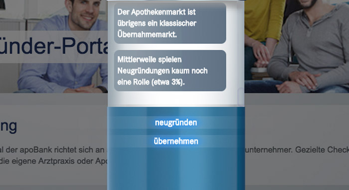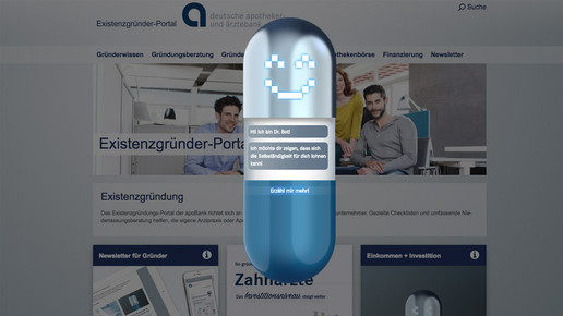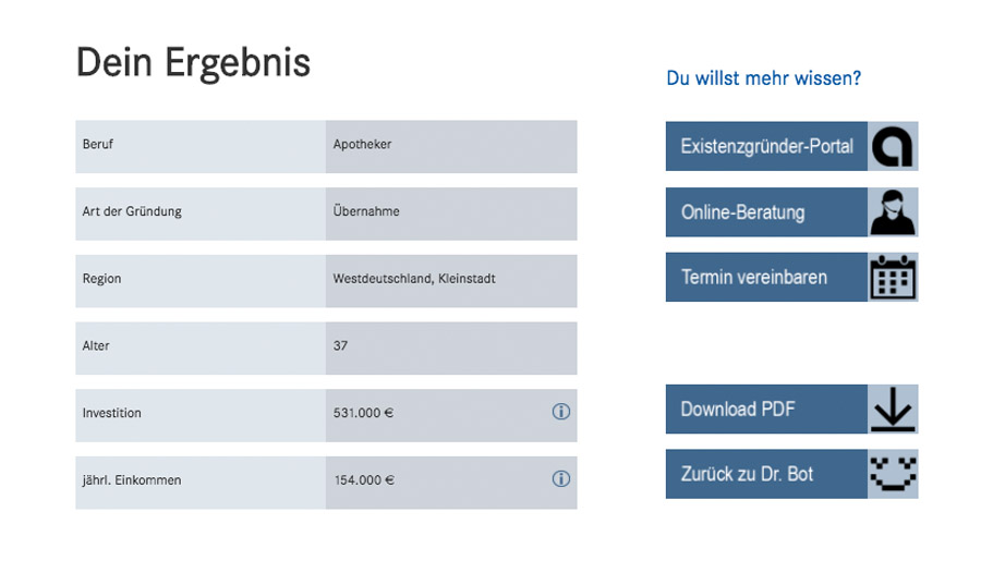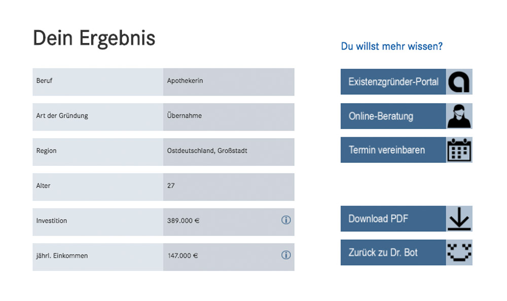 Dr. Bot ist eine Art Existenzgründungsrechner, von denen es für andere Fragestellungen im Internet zahlreiche Varianten zu finden gibt. Ärzte oder Apotheker können recherchieren, ob sich eine Existenzgründung oder Übernahme von Praxen oder Apotheken lohnt: Auf einer Deutschlandkarte kann man eine Region anklicken, sein Alter und Geschlecht eingeben, und schon erhält man überraschend positive Informationen zu seinen Absichten.