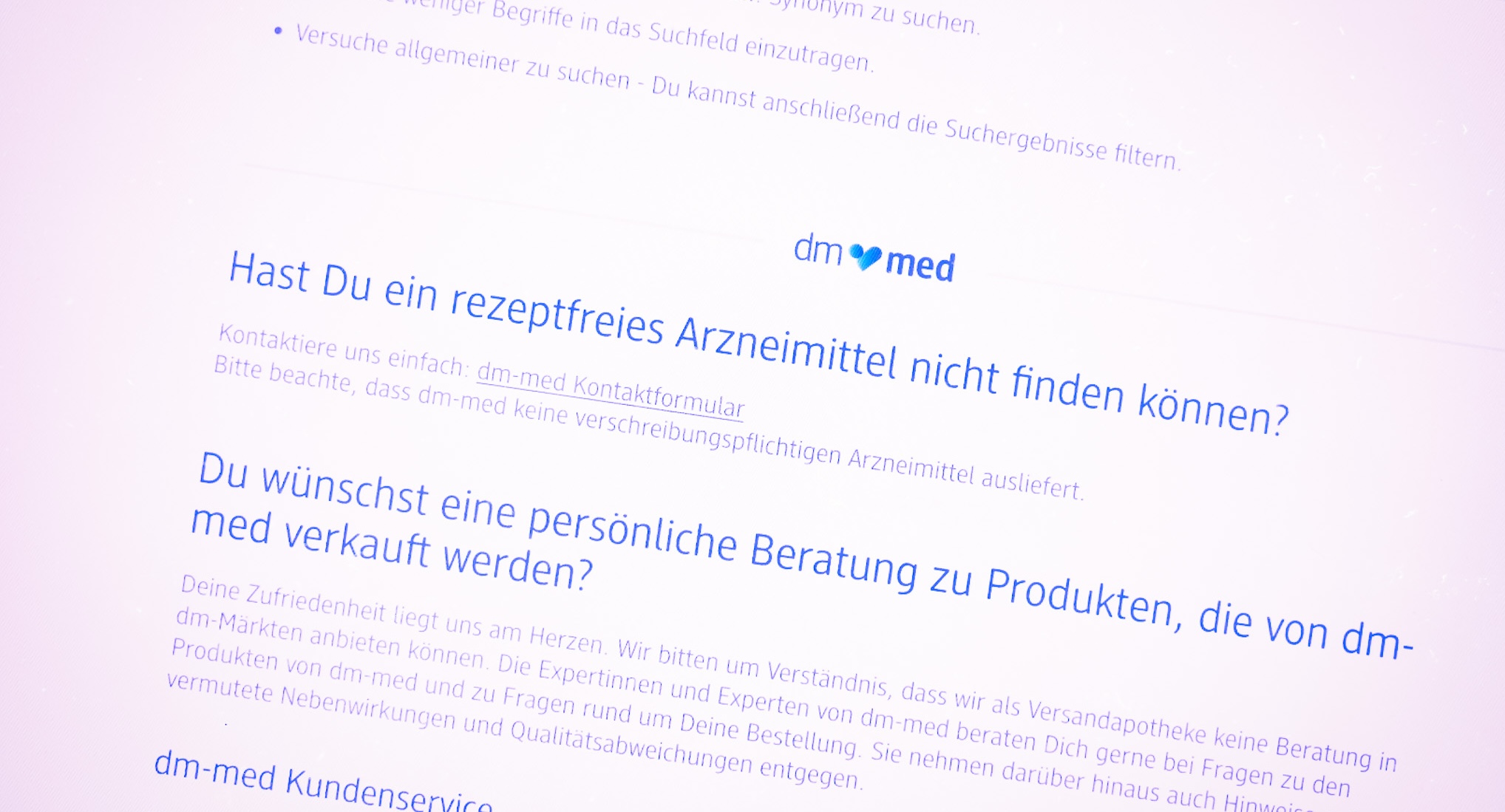 Für Kundinnen und Kunden, die nicht fündig werden, hat der Konzern noch einen Tipp: „Hast Du ein rezeptfreies Arzneimittel nicht finden können? Kontaktiere uns einfach!“