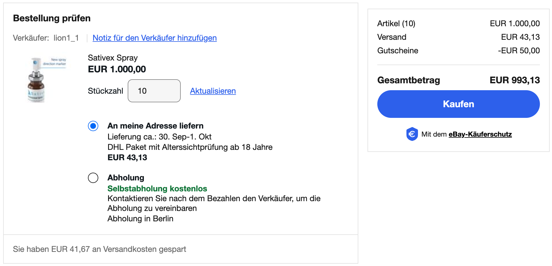 Derzeit werden 10-Milliliter-Flaschen Sativex-Spray (THC/CBD, Almirall) von einem privaten Anbieter angeboten – für 100 Euro pro Stück oder Preisvorschlag. Obendrauf kommen noch Versandkosten in Höhe von 8,48 Euro, die der Verkäufer als „DHL Paket mit Alterssichtprüfung ab 18 Jahre“ angibt. Mehr als zehn Flaschen will der Verkäufer noch vorrätig haben. Offiziell gelistet ist die N1-Größe mit drei Flaschen à 10 Milliliter mit einer UVP von 353,87 Euro.