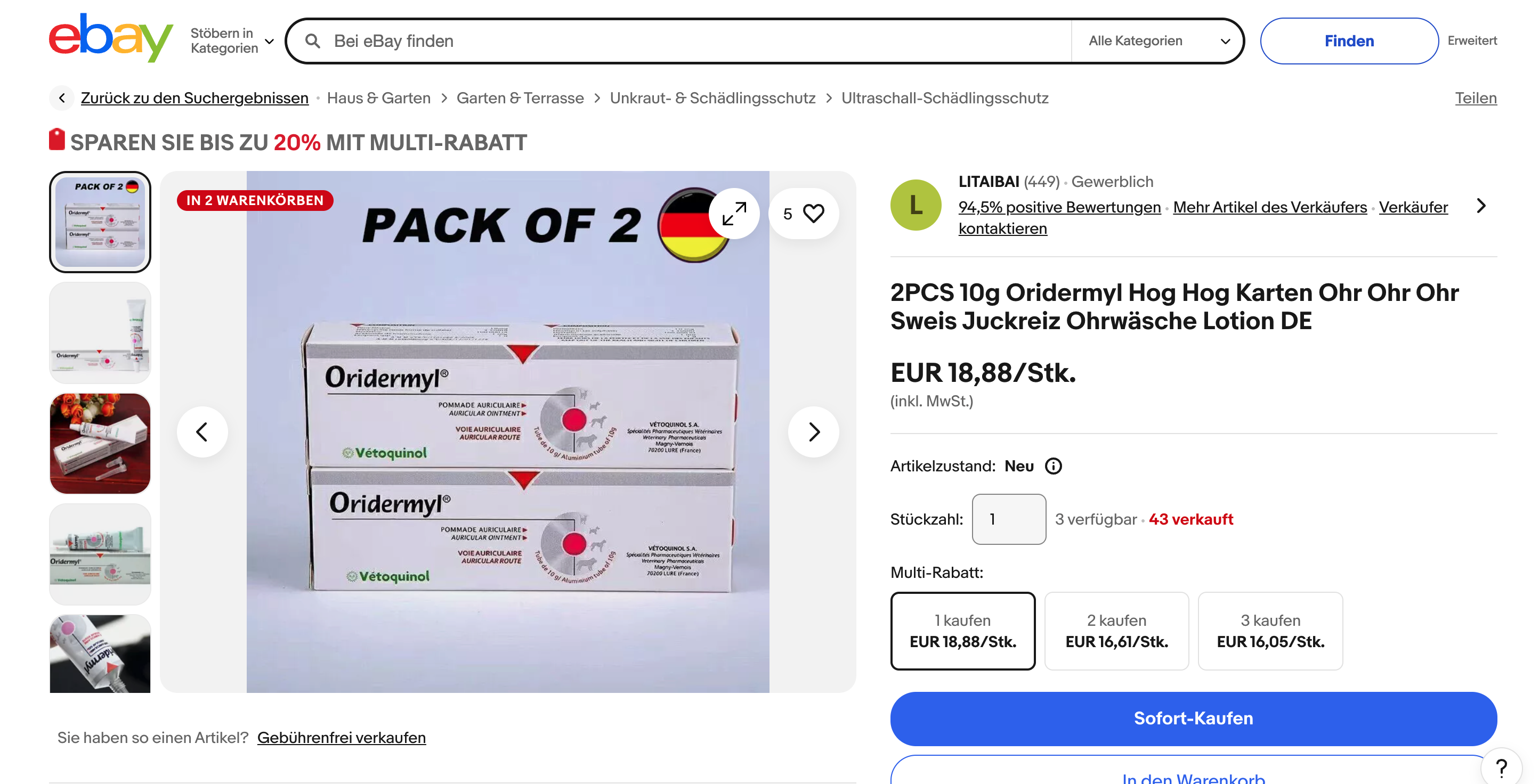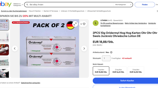 Auf Ebay bieten rund 40 Verkäufer das verschreibungspflichtige Tierarzneimittel Oridermyl an – trotz der fehlenden Zulassung in Deutschland. Die Verkaufszahlen erreichen dabei dreistellige Werte – Multirabatt und kostenlose Rücksendung inklusive. Dabei ist die Anwendung durch Laien keinesfalls ungefährlich.