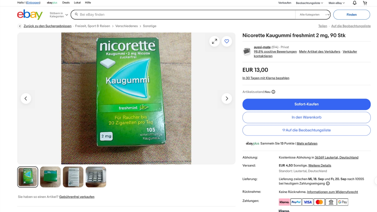 Im Fall einer Anzeige über Nicorette-Kaugummi heißt es seitens der Plattform: „Wir haben Ihre Meldung geprüft und festgestellt, dass das Angebot nicht gegen unsere Grundsätze verstößt. Diese Entscheidung wurde von einem Mitglied unseres Kundenserviceteams getroffen.“ Laut Artikelbeschreibung des Privatverkäufers handelt es sich um einen Restbestand, der stets bei Zimmertemperatur gelagert und in einer deutschen Apotheke erworben wurde.