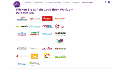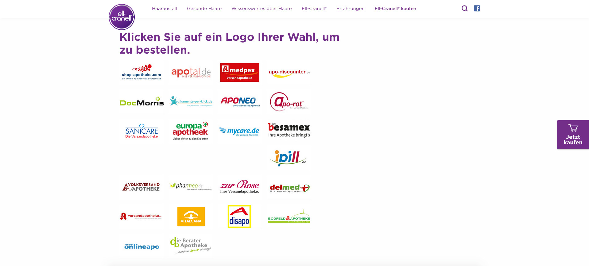 Kunden sollten das apothekenpflichtige Haarwuchsmittel „ganz einfach von zu Hause“ bestellen. Galderma listet derzeit 23 Versandapotheken auf, darunter bekannte Marken wie DocMorris, Shop-Apotheke, Europa Apotheek und Zur Rose. Auch weniger große Versender wie Bodfeld-Apotheke, Meine-Onlineapo oder die „Berater Apotheke“ werden empfohlen. „Klicken Sie auf ein Logo Ihrer Wahl, um zu bestellen.“