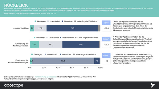Die Corona-Krise zeitigt weiterhin wirtschaftliche Folgen in den Apotheken. Die Inhaber sollten konkret die Mai-Umsätze für dieses und das vergangene Jahr vergleichen. Fast drei Viertel der Apothekenleiter (74 Prozent) klagt über sinkende Erlöse. Bei 18 Prozent ist der Umsatz vergleichbar mit dem Vorjahr, nur in 5,6 Prozent der Betriebe gestiegen. Und der Abwärtstrend schient anzuhalten: Gegenüber dem Vormonat verzeichnen nur 13 Prozent eine steigende Nachfragesituation, 38 Prozent dagegen eine verschlechterte.
