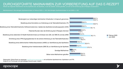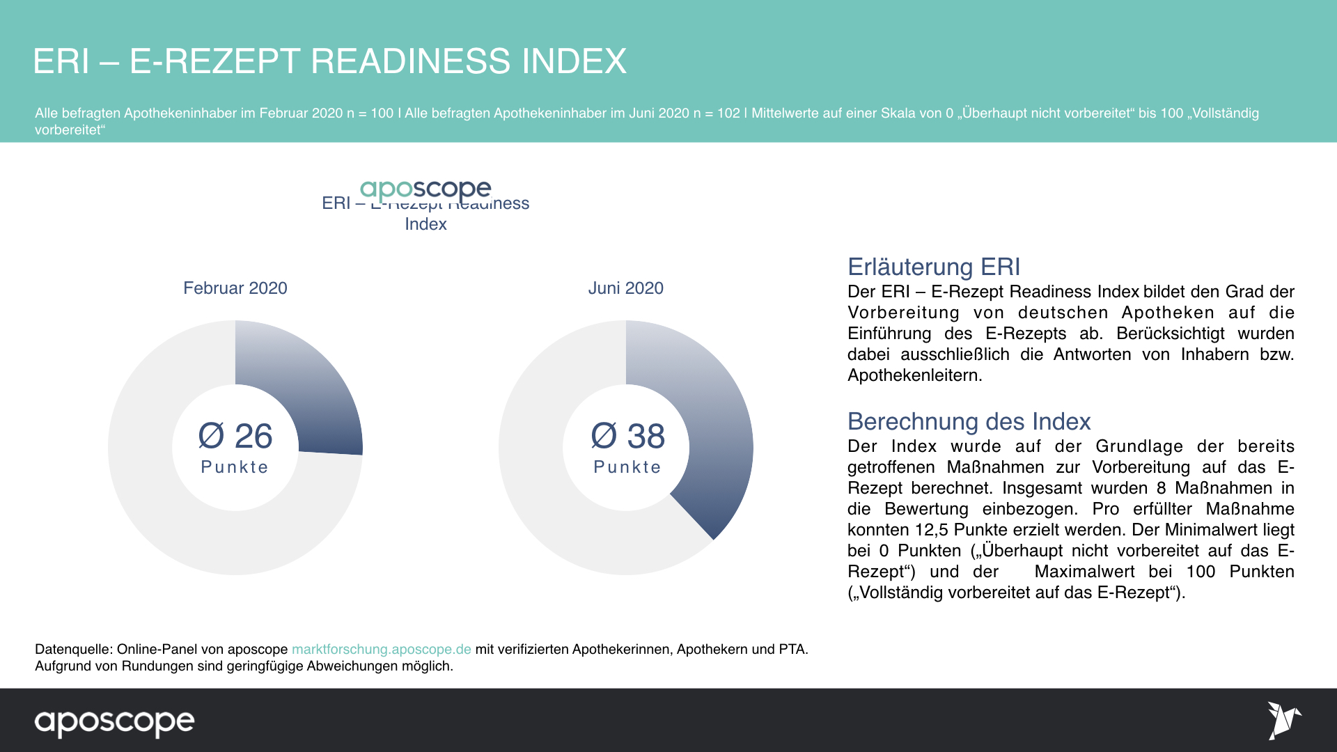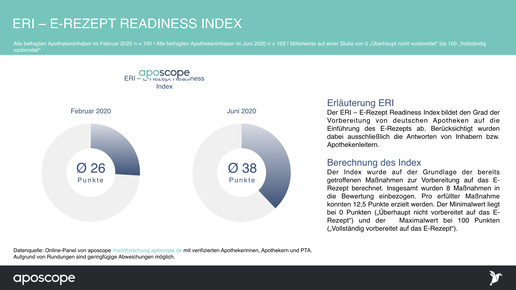 Aus verschiedenen Maßnahmen zur Vorbereitung auf das E-Rezept berechnen die Marktforscher von aposcope den E-Rezept Readiness Index (ERI). Auf einer Skala von 0-100 erreichen die Apotheken einen Wert von 38,4. Der ERI soll in den kommenden Monaten regelmäßig erhoben werden, um die Entwicklung abzubilden.