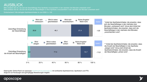Besteht wenigstens Aussicht auf Besserung? Jein. Immerhin 21 Prozent hoffen darauf, dass sich die Geschäftslage in den kommenden drei Monaten verbessern wird, 46 Prozent gehen von einer gleichbleibenden Situation aus. Auf der Schattenseite befürchten 27 Prozent eine weitere Verschlechterung. Entsprechend schätzen die meisten (78 Prozent), dass sich die Zahl der Beschäftigten in den Apotheken zeitnah nicht ändern wird. Doch immerhin 16 Prozent planen in den kommenden Monaten mit einem Personalabbau.