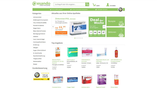 Esando charakterisiert sich selbst mit der Fußnote „... einfach immer günstig!“ Mehr als 100.000 Artikel warten nach Firmenangaben darauf, von den Besuchern entdeckt zu werden, bis zu 60 Prozent Einsparung seien drin. In den einschlägigen Vergleichsportalen sind die Angebote bereits zu finden; bei Medizinfuchs ist der Newcomer – dank guter Quote dank wenig Bewertungen – sogar als Topapotheke geführt.