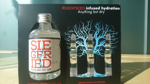 Siegfried Hydro ist eine Ampulle speziell für die Männerhaut. Die Haut wird vitalisiert und durchfeuchtet. Die Ampulle ist eine Kooperation zwischen Siegfried Rheinland Dry Gin und Dr. Hobein. „Beide Familien sind befreundet und die Unternehmen werden von den Töchtern und Söhnen geführt“, erzählt Christina Hansen, Sales & Marketing Assistenz bei Dr. Hobein. Siegfried Hydro ist die erste Gin-Ampulle – ansonsten gibt es etwa sechs Kosmetika, die Wachholderschnaps enthalten.