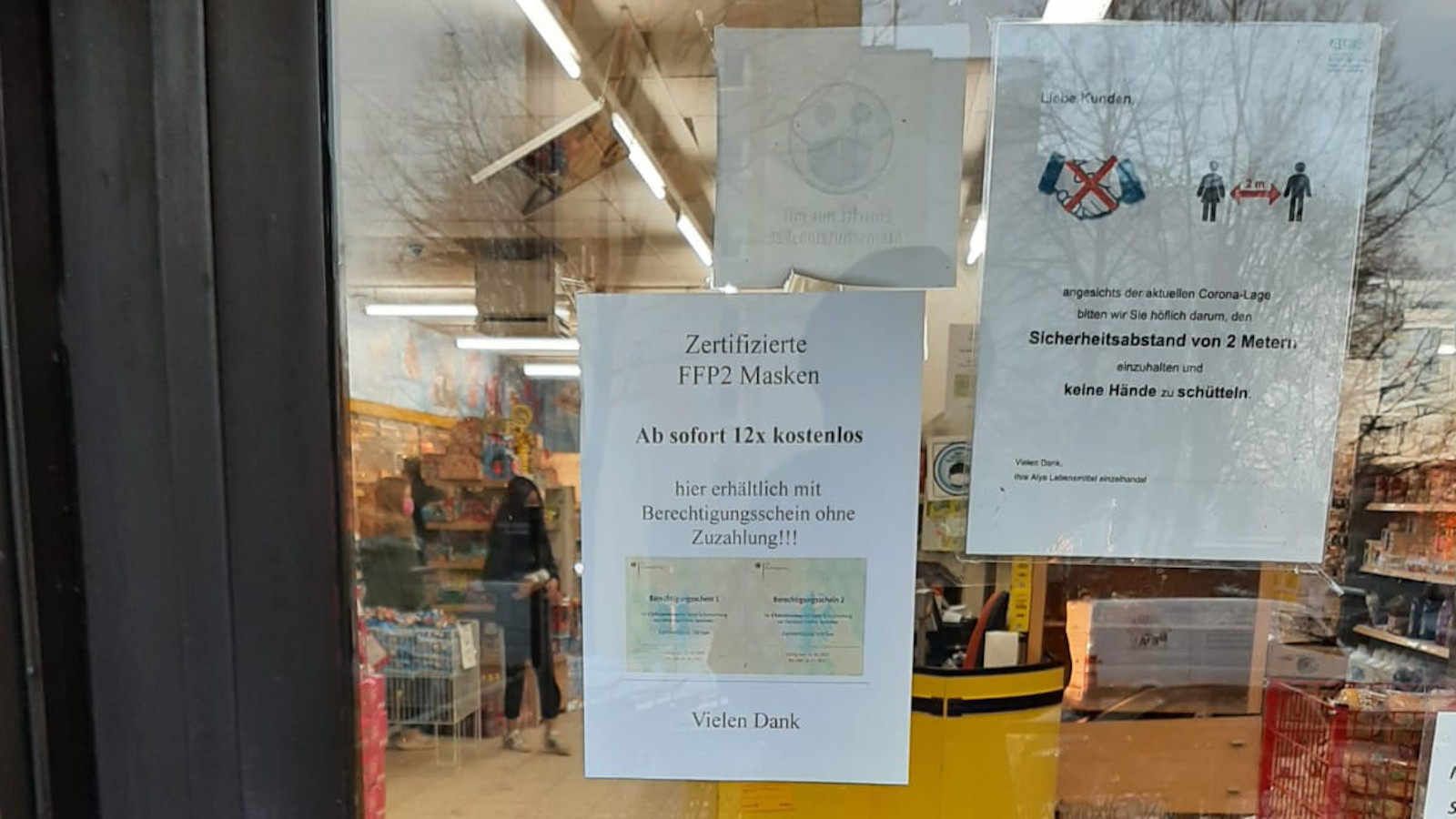 Lebensmittel, Backwaren, Metzgerei, Feinkost – und FFP2-Masken auf Berechtigungsschein. Damit wirbt ein Supermarkt im bayerischen Freising seit über zwei Wochen nicht nur in sozialen Medien, sondern auch mit einem Aushang am Eingang des Marktes. „Zertifizierte FFP2-Masken ab sofort 12x kostenlos“, heißt es auf einem ausgedruckten A4-Blatt am Eingang. „Hier erhältlich mit Berechtigungsschein ohne Zuzahlung!!!“, steht darunter, gefolgt von einem Bild zweier Scheine. Das sprach sich schnell rum – und kam auch bei der Apotheke schräg gegenüber schnell an.