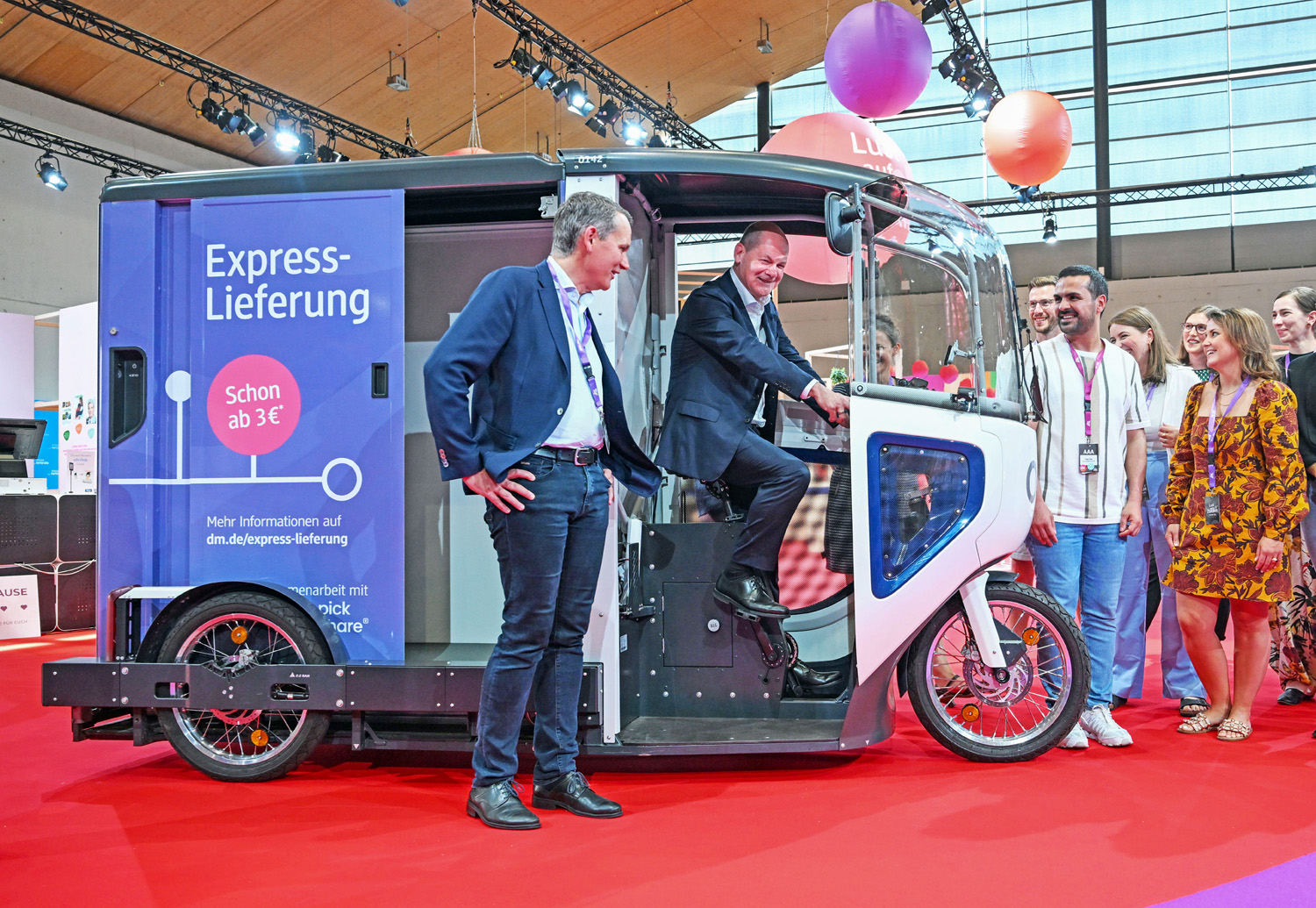 Im Anschluss an seine Rede besichtigte der Bundeskanzler ein Lastenrad, mit dem dm bereits in sechs deutschen Großstädten am selben Tag Expresslieferungen ausliefert. Der Kanzler nahm sich außerdem Zeit für ein Gespräch mit 14 Mitarbeiterinnen und Mitarbeitern.