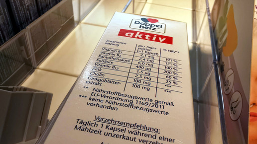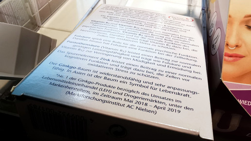Auf der Rückseite sind die Inhaltsstoffe – B-Vitamine, Folsäure, Pantothensäure, Zink und Cholin – und die ihnen jeweils zugeschriebenen Wirkungen abgedruckt. Aussagen zu den Effekten von Ginkgo sucht man allerdings auch hier vergebens. Ganz am Ende der Liste heißt es eher lexikalisch: „Der Ginkgo-Baum ist widerstandsfähig und sehr anpassungsfähig. In Asien ist der Baum ein Symbol für Lebenskraft.“