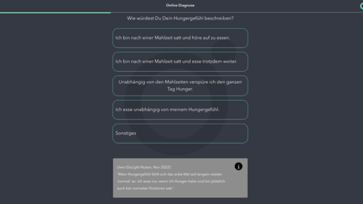 Die Frage zum Hungergefühl ist eine Multiple-Choice-Prüfung; um die richtigen Antworten zu geben, ist auch GoLight-Nutzer Uwe mit am Start: „Ich esse nur, wenn ich Hunger habe und bin plötzlich auch bei normalen Portionen satt“, prangt seine Rezension direkt unter den Antwortmöglichkeiten, dann muss für den Therapieanspruch wohl das Gegenteil der Fall gewesen sein. Darauf folgen unter anderem Fragen nach der sportlichen Akvitität und dem Blutdruck, auch Vorerkrankungen und Kontraindikationen werden abgefragt.