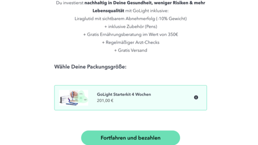 Mit GoLight setzt die Plattform auf den Trend der Abnehmspritzen: „Weniger Kilos, mehr Erektion“ lautet der Slogan. „Die fetten Jahre sind vorbei. Schluss mit Scham, Frust & Stigma!“ So wirbt der Anbieter für eine Liraglutid-Therapie (Saxenda, Novo Nordisk), sogar das Logo der Adipositas-Hilfe Deutschland prangt unter dem Werbespruch. Das Arzneimittel muss einmal täglich injiziert werden, im Gegensatz zu Semaglutid (Ozempic) ist es seit April 2016 auch zur Gewichtsabnahme bei Übergewicht und Adipositas zugelassen.