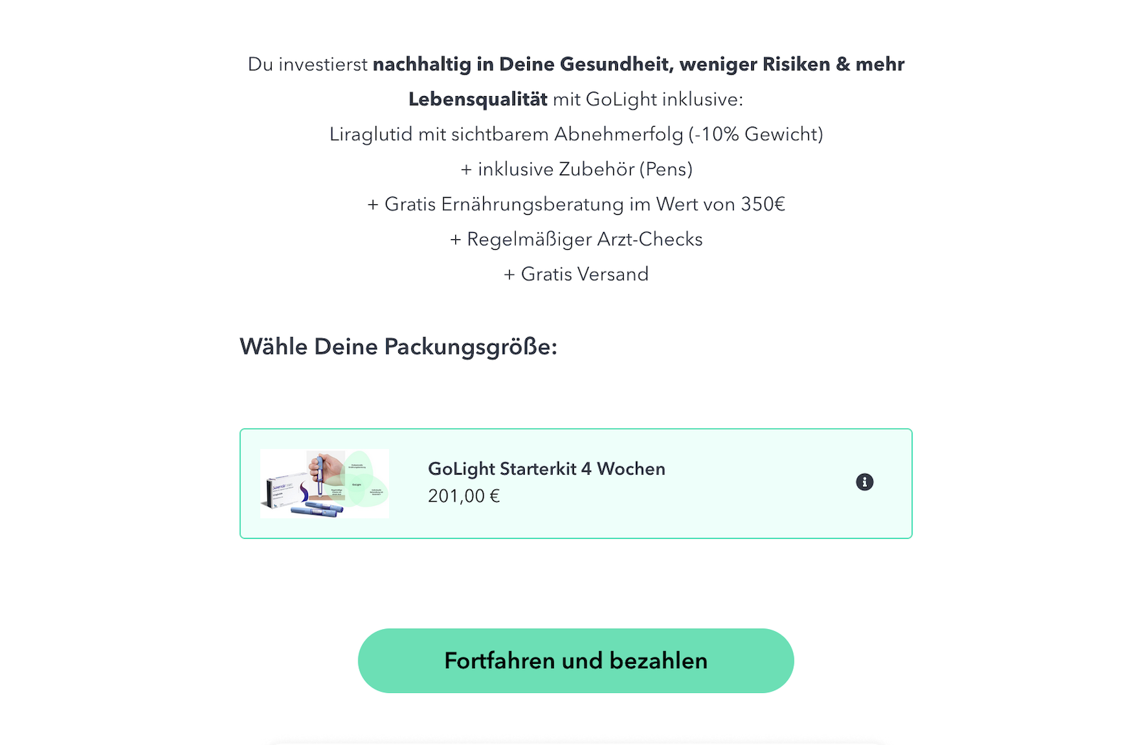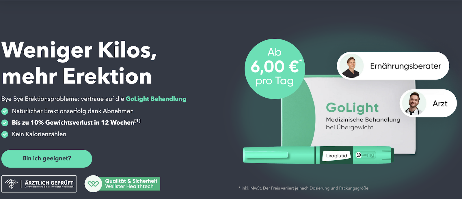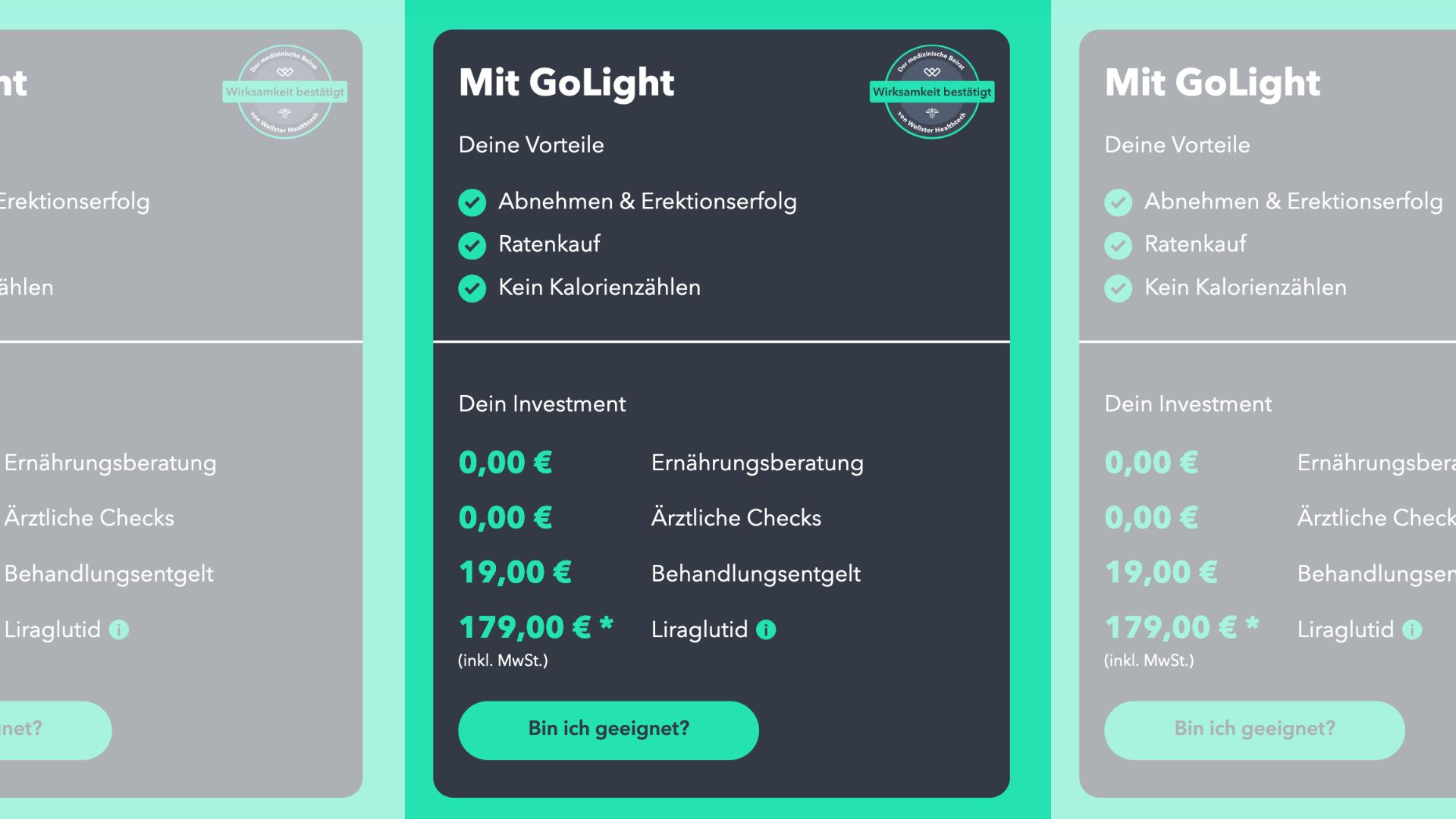 Mit GoLight setzt die Plattform auf den Trend der Abnehmspritzen: „Weniger Kilos, mehr Erektion“ lautet der Slogan. „Die fetten Jahre sind vorbei. Schluss mit Scham, Frust & Stigma!“ So wirbt der Anbieter für eine Liraglutid-Therapie (Saxenda, Novo Nordisk), sogar das Logo der Adipositas-Hilfe Deutschland prangt unter dem Werbespruch. Das Arzneimittel muss einmal täglich injiziert werden, im Gegensatz zu Semaglutid (Ozempic) ist es seit April 2016 auch zur Gewichtsabnahme bei Übergewicht und Adipositas zugelassen.