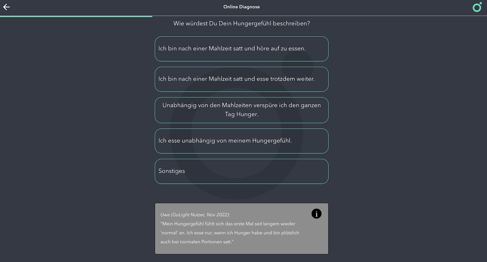 Die Frage zum Hungergefühl ist eine Multiple-Choice-Prüfung; um die richtigen Antworten zu geben, ist auch GoLight-Nutzer Uwe mit am Start: „Ich esse nur, wenn ich Hunger habe und bin plötzlich auch bei normalen Portionen satt“, prangt seine Rezension direkt unter den Antwortmöglichkeiten, dann muss für den Therapieanspruch wohl das Gegenteil der Fall gewesen sein. Darauf folgen unter anderem Fragen nach der sportlichen Akvitität und dem Blutdruck, auch Vorerkrankungen und Kontraindikationen werden abgefragt.