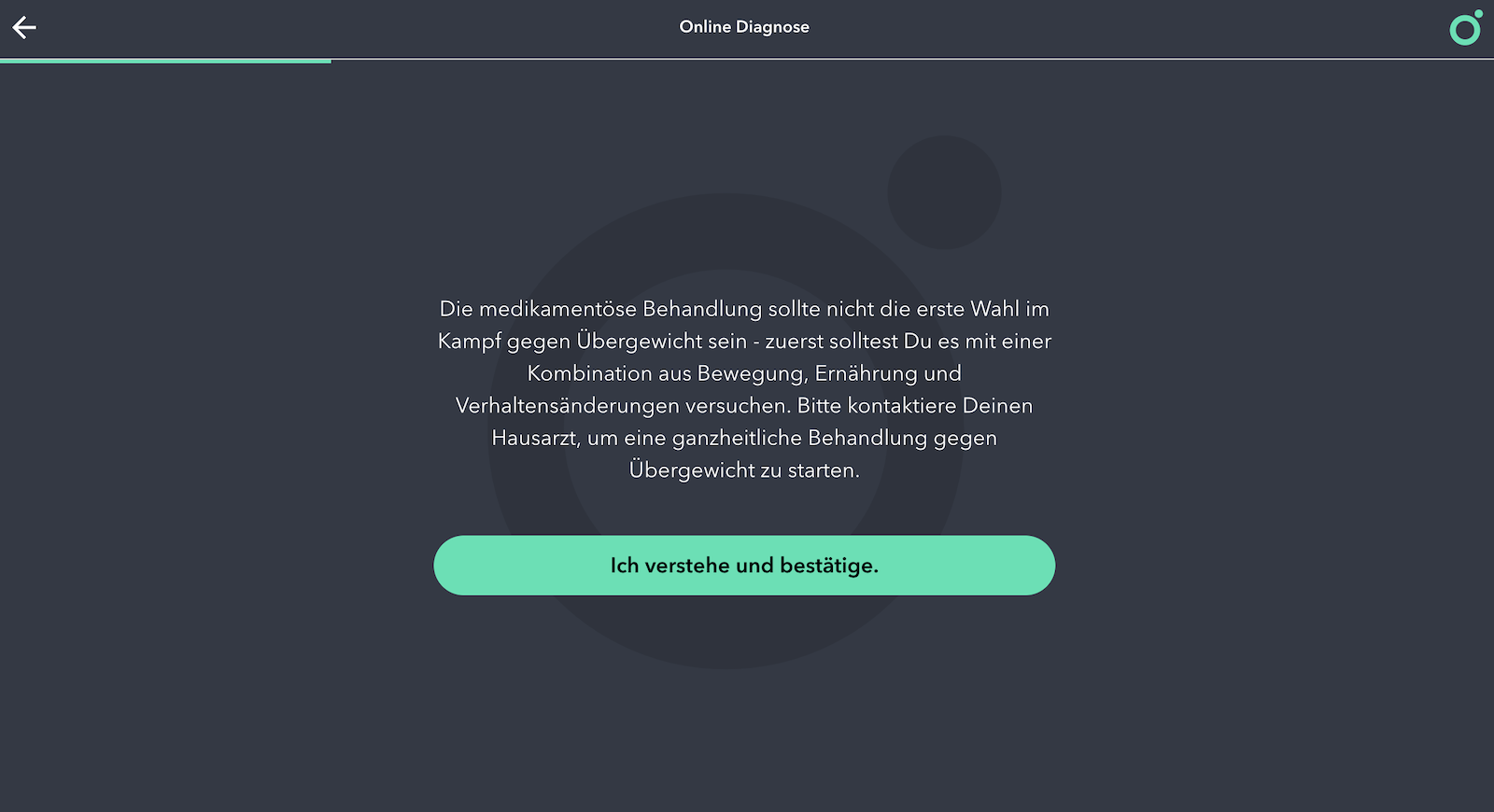 Antwortet man auf die letzte Frage stumpf mit „nein“, folgt ein moralischer Zeigefinger getarnt als Pop-Up: Die medikamentöse Therapie sei niemals der erste Schritt bei der Gewichtsreduktion. Trotzdem kann der Fragebogen danach unbeirrt weiter ausgefüllt werden.