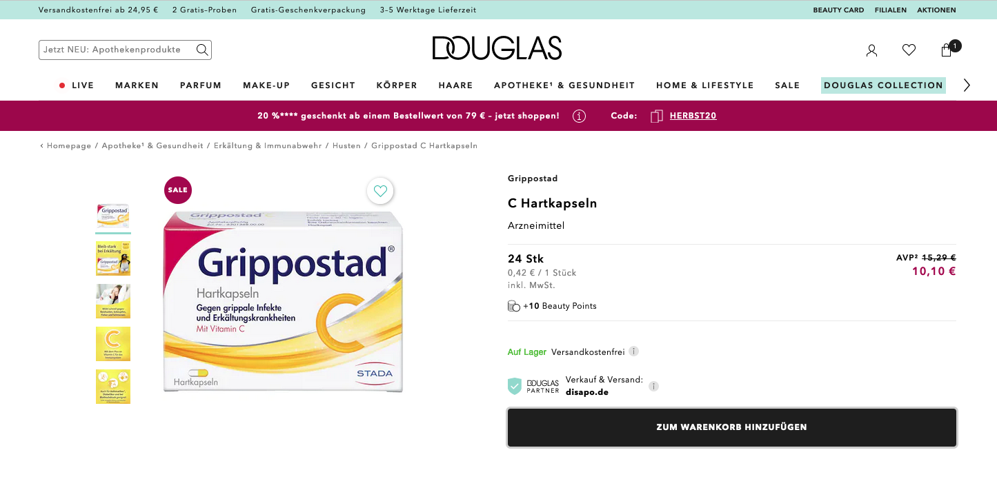Auf der Homepage von Douglas gibt es die Kategorie Apotheke & Gesundheit. Allerdings weist die Fußnote schon im Reiter darauf hin, dass die Medikamente bei der Partner-Apotheke bezogen werden. „Douglas selbst betreibt keine Apotheke und ist auch nicht berechtigt, apothekenpflichtige Produkte abzugeben oder zu diesen pharmazeutisch zu beraten.“ Bei den entsprechend gekennzeichneten Angeboten handele es sich allein um solche der Douglas-Partner-Apotheke Disapo.