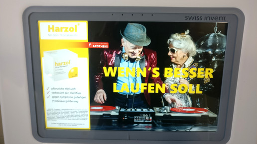 Sogenannte smarte Urinale präsentieren Männern beim Urinieren auf öffentlichen Toiletten Werbung auf Displays. Abanta testet die Werbeform bis Sonntag in Niedersachsen. An 35 Toiletten und insgesamt 233 Urinalen wird eine Woche lang eine Anzeige für das OTC-Präparat eingespielt. Zu sehen ist ein Senioren-Paar an einem DJ-Pult und der Slogan „Wenn’s besser laufen soll“. Zudem werden Packung und Produktbeschreibungen sowie der Hinweis, dass Harzol rezeptfrei in der Apotheke erhältlich ist, eingeblendet.
