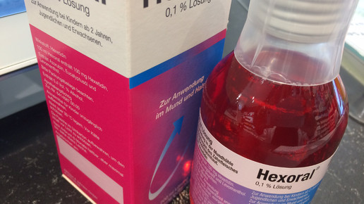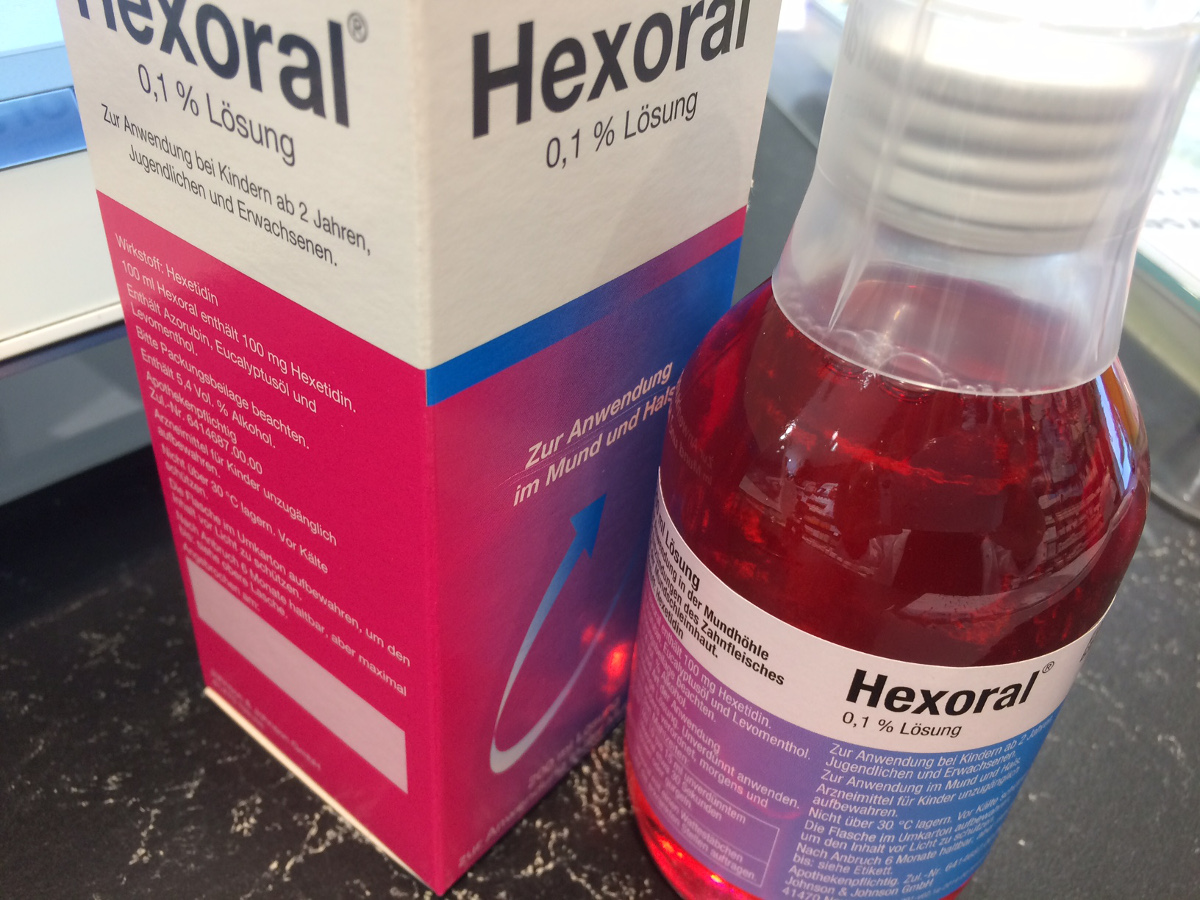 Tatsächlich wurde ein neuer Hinweis in die Produktinformation aufgenommen: „Wenn die Symptome anhalten oder schlimmer werden oder neue Symptome auftreten, sollte die Behandlung unterbrochen und ein Arzt oder Zahnarzt aufgesucht werden.“ Neu ist auch der Anwendungshinweis: „Nach der Behandlung ausspucken. Nicht schlucken. Kinder von 6 bis 8 Jahren nur unter Aufsicht spülen oder gurgeln lassen.“ Bis zum Alter von sechs Jahren soll Hexoral maximal dreimal täglich angewendet werden.