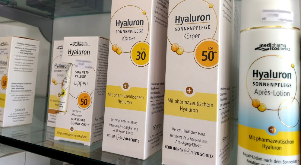 Neu ist ebenfalls die Hyaluron Sonnenpflege Ani-Pigment für das Gesicht. Der UV-Schutz ist auch als Fluid für Gesicht und Körper sowie als Körperspray erhältlich. Zudem wurde im Frühjahr das getönte Hyaluron Nude Perfection Fluid in die Apotheke gebracht.