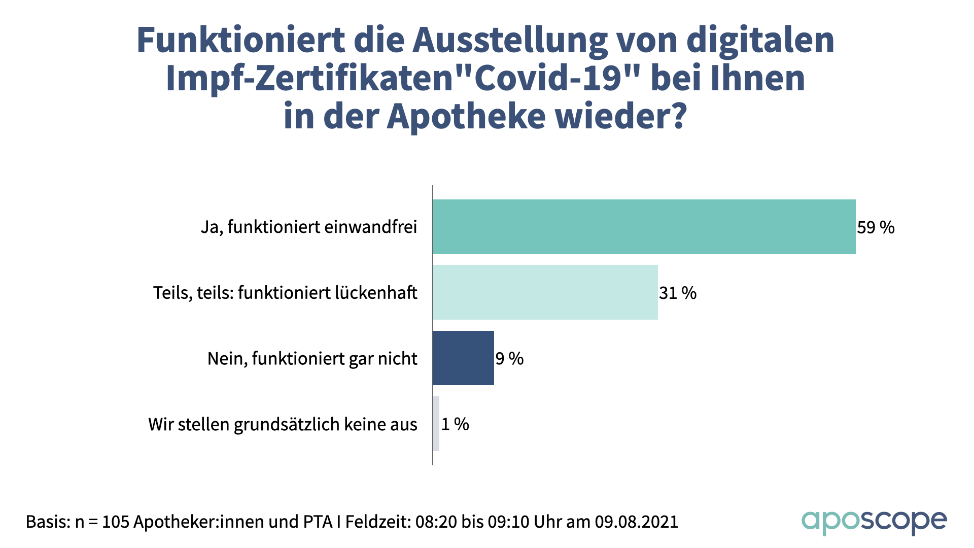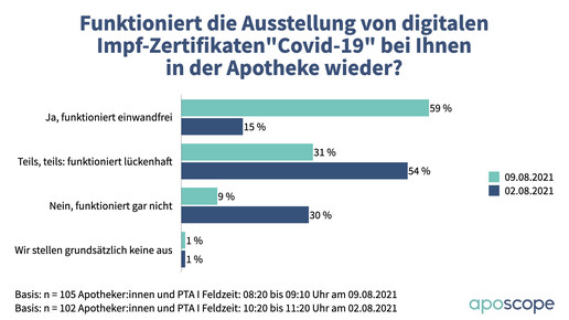 9 Prozent der Apotheken konnten jedoch nicht einmal das. Sie gaben an, dass das Portal bei ihnen noch gar nicht wieder funktioniert. 1 Prozent gab an, prinzipiell auf die Ausstellung von digitalen Impfzertifikaten zu verzichten. Wie hoch der Anteil derer ist, die das aufgrund fehlenden Anschlusses an die Telematikinfrastruktur (TI) nicht teilnehmen können, wurde dabei nicht erhoben. 105 verifizierte Apotheker:innen und PTA aus dem gesamten Bundesgebiet hatten am Montagmorgen bei apsocope Angaben zur Zertifikatsausstellung gemacht.