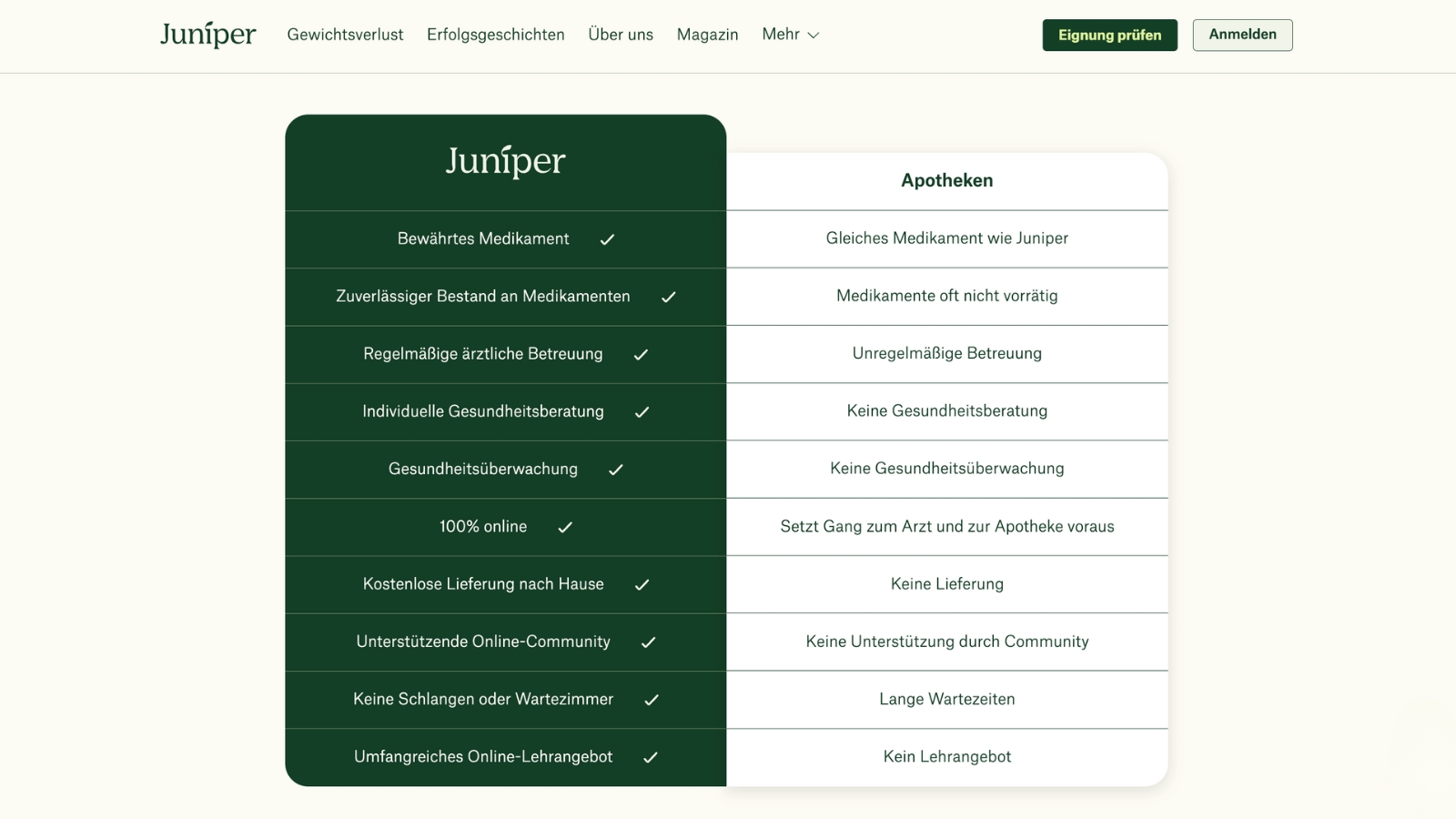 Juniper betont, dass es in ihrem Programm eine regelmäßige ärztliche Betreuung gebe, während Apotheken nur eine unregelmäßige Betreuung böten. Zudem finde in Apotheken keine individuelle Gesundheitsberatung oder Gesundheitsüberwachung statt. Eine kostenlose Lieferung nach Hause, die Juniper garantiert, gebe es bei Apotheken ebenfalls nicht. Zudem garantiert die Plattform – nach eigenen Angaben anders als Apotheken – einen „zuverlässigen Bestand an Medikamenten“.