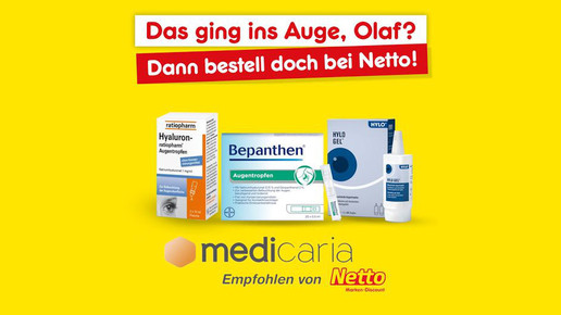 „Das ging ins Auge, Olaf? Dann bestell doch bei Netto!“ So lautet der Claim auf einer Kachel, die der Discounter bei Facebook veröffentlicht hat. Abgebildet sind drei verschiedene Augentropfen mit Hyaluronsäure: Bepanthen (Bayer), Hylo (Ursapharm) und Hyaluronsäure Ratiopharm.