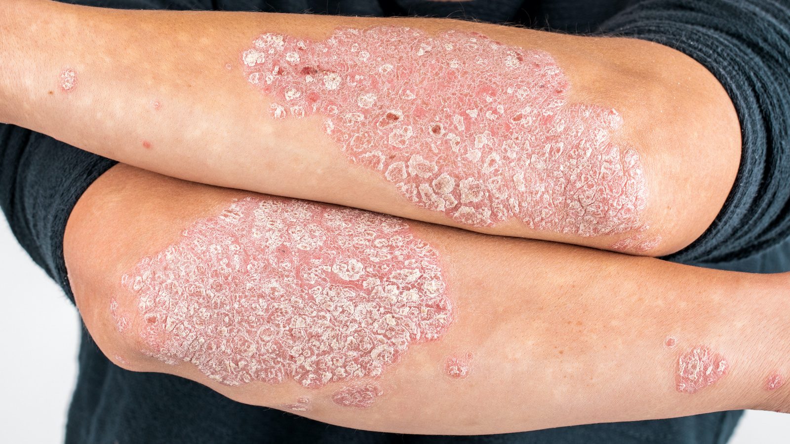 Etwa zwei Millionen Deutsche leiden unter den Symptomen der Schuppenflechte. Durch bestimmte Reize wird in der Haut eine Entzündungsreaktion ausgelöst. Der Körper versucht den vermeintlichen Schaden zu heilen und bildet vermehrt Hautzellen: Eine gesunde Haut erneuert sich etwa alle 27 Tage, bei Psoriatiker:innen läuft dieser Prozess etwa zehnmal so schnell ab. Dadurch sammeln sich die Zellen an der Hautoberfläche an und es entsteht die sichtbare Schuppung und Verhornung der Autoimmunerkrankung.