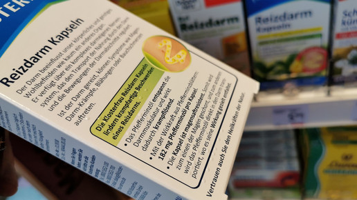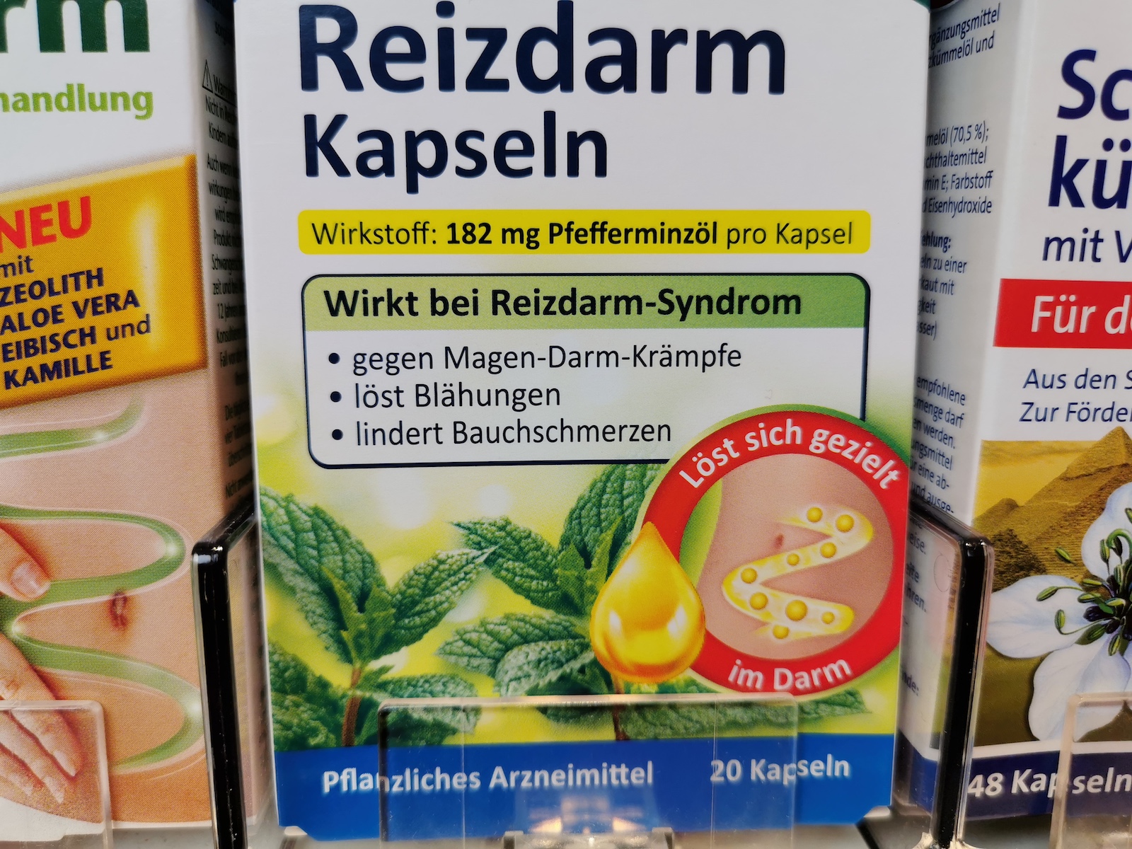 Carmenthin (Dr. Willmar Schwabe) enthält ebenfalls Pfefferminzöl, allerdings in Kombination mit Kümmelöl. Das pflanzliche Arzneimittel ist jedoch nicht zur Behandlung von Reizdarm zugelassen, sondern wird angewendet bei dyspeptischen Beschwerden, besonders mit leichten Krämpfen im Magen-Darm-Bereich, Blähungen, Völlegefühl.