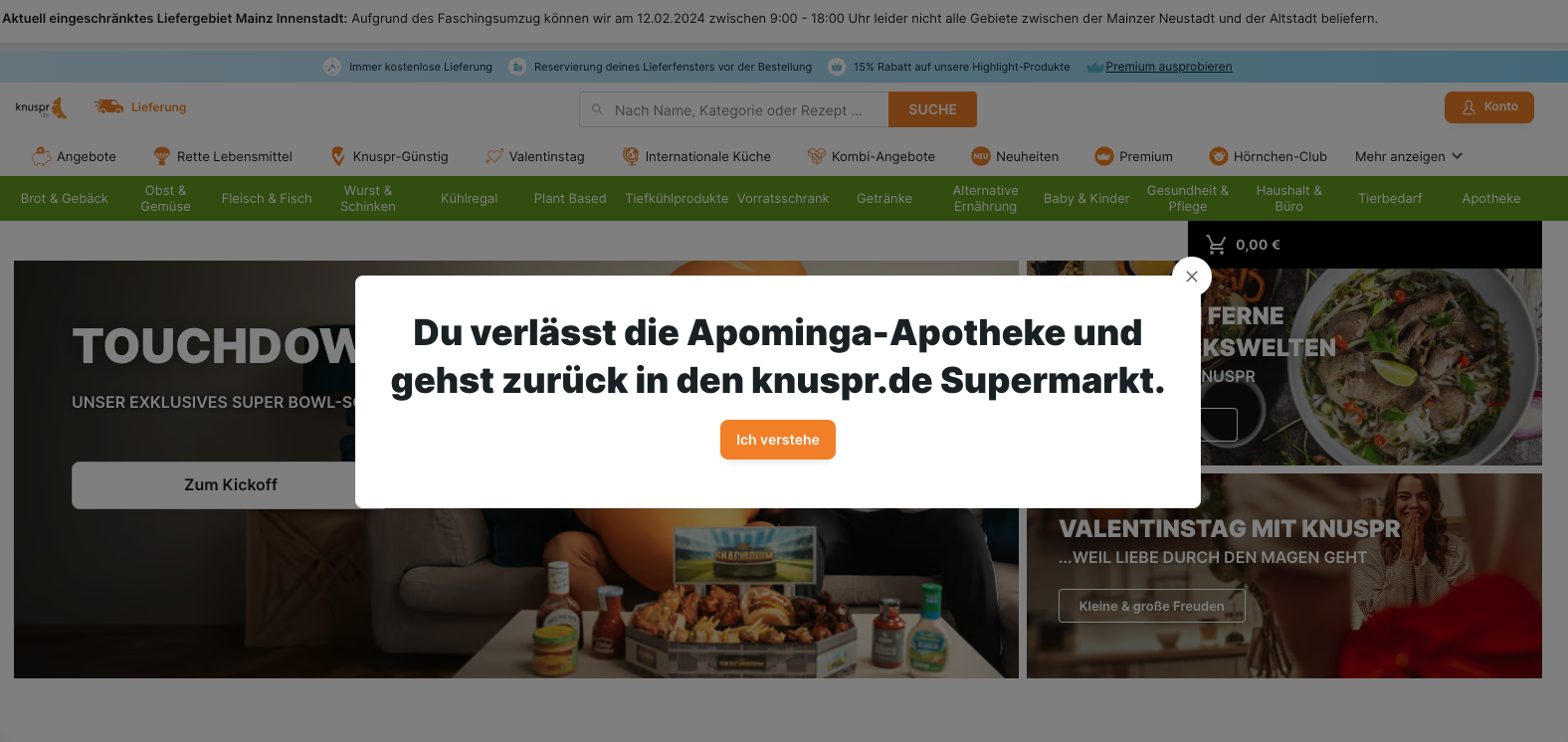 In Berlin geht die Apotheke mit rund 3000 Produkten an den Start. Branchenkennern zufolge handelt es sich beim neuen Partner um die Preussen Apotheke von Martin Stahn, die auch mit der Shop Apotheke kooperiert. Der Bestellvorgang von Apothekenprodukten ist getrennt von der Supermarktware. Der Verbraucher wird beim Anklicken von „Apotheke“ bewusst darauf hingewiesen, dass er den Online-Shop von Knuspr verlässt und den Online-Shop der Apotheke betritt. Bezahlt wird über Knuspr.