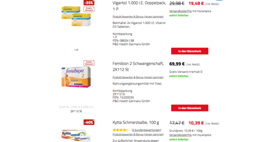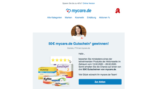 Die Aktion setzt Mycare mit Produkten von Procter & Gamble (P&G) um. Bewertet werden sollen rund 40 verschiedene Präparate von vier Marken – es geht um das Nasenspray Nasivin, Kytta-Schmerzsalbe sowie die Nahrungsergänzungsmittel Vigantol und Femibion.