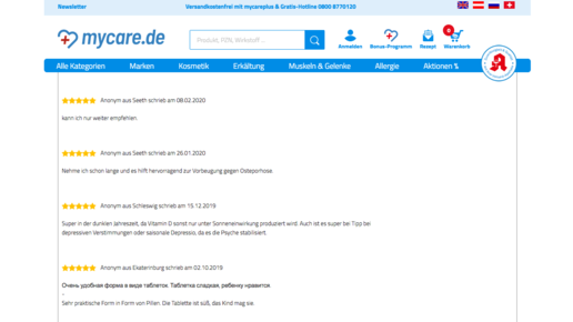 Sowohl für Mycare als auch die an der Aktion beteiligten Hersteller sind möglichst viele Bewertungen nützlich. Gute sowieso, aber generell wird Interaktion beim Google-Ranking belohnt. Der tatsächliche Nutzen für die Kunden dürfte von nachgelagerter Bedeutung sein – zumindest bislang: Aktuell die meisten Bewertungen unter den Aktions-Produkten hat Kytta-Schmerzsalbe mit 44 Einträgen, darunter etwa fünf Sterne von Anonym: „Hat eine sehr gute Wirkung.“ Die allermeisten Produkte haben nur eine einstellige Anzahl an Bewertungen oder noch gar keine.