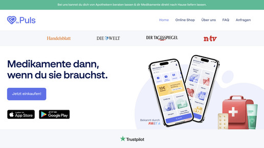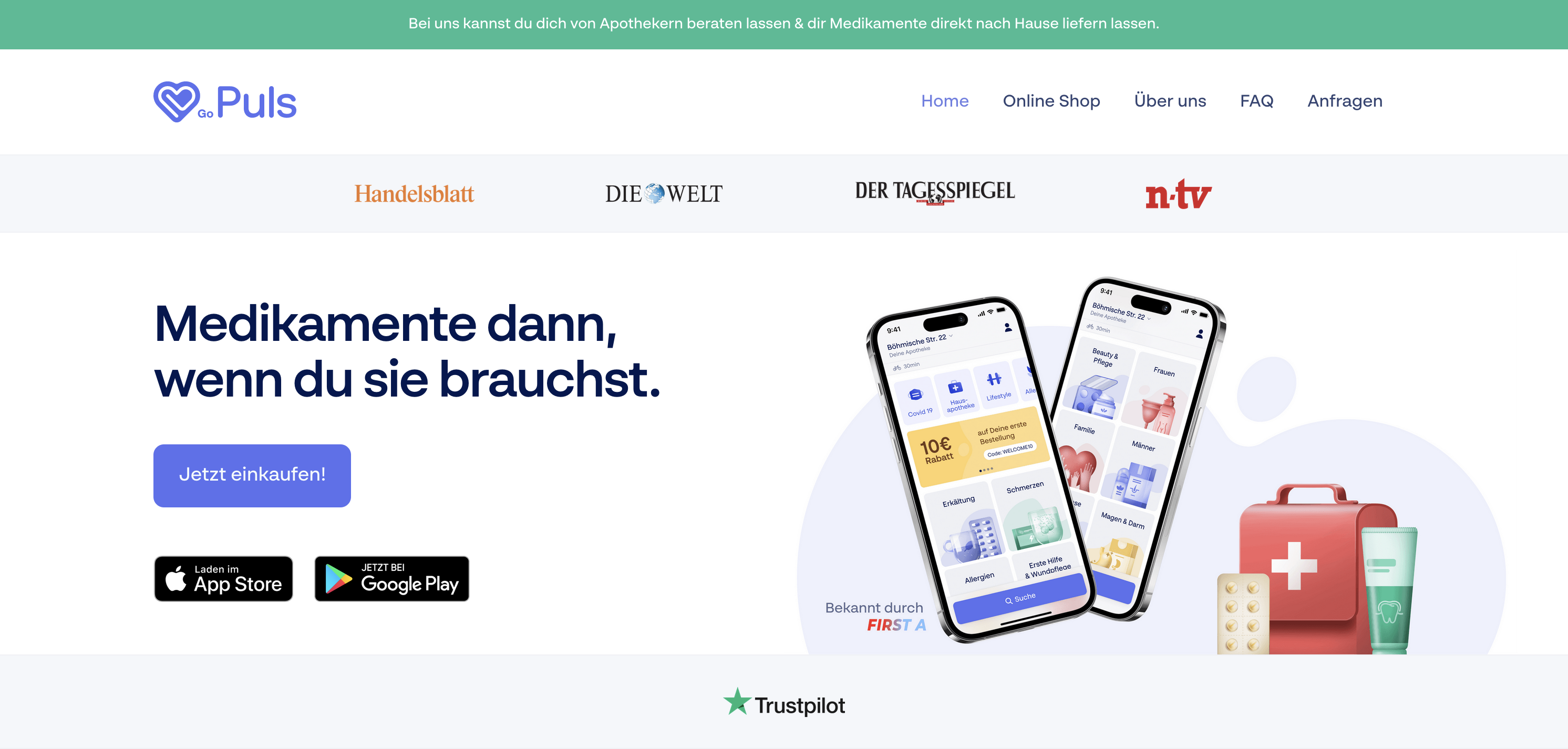 Als „bekannt durch FirstA“ wird GoPuls auf der Website beworben. In der Geschäftsführung sind Antonie Nissen, Leif Löhde und Florian Swoboda – die beiden Erstgenannten auch bei First A. Auch die Berliner Anschrift ist identisch, unter der angegebenen Rufnummer ertönt eine Ansage von First A. Die Links zum App Store und Google Play laufen noch ins Leere, auch bei den internen Links funktioniert noch nicht alles. Der Lieferdienst wurde zwischenzeitlich von Shop Apotheke übernommen und mit dem Expressdienst des Versenders verknüpft.
