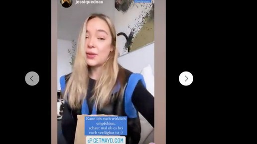 Die Influencer:innen nutzen vor allem sogenannte Storys – also kurze Beiträge bei Instagram oder Facebook – in denen per Video oder Foto auf Mayd hingewiesen wird. Die Storys sind in der Regel nach einiger Zeit wieder verschwunden. Eine bekannte Mayd-Partnerin ist Seyda Taygur. Ihrem Kanal „Sissyssecrets“ folgen rund 253.000 Follower:innen. Bekannt ist sie unter anderem für Kochbücher, die es in die Spiegel-Bestsellerlisten schafften. Sie wirbt für zahlreiche Produkte und setzt sich und ihre Familie dabei in Szene.