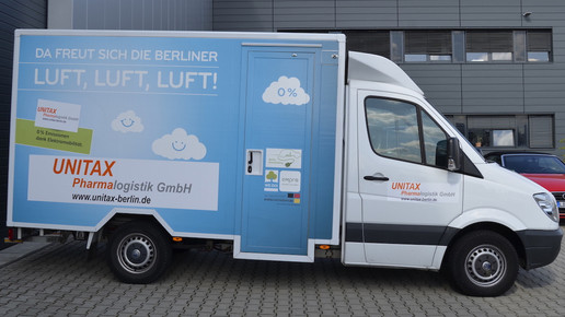 „Da freut sich die Berliner Luft, Luft, Luft“ steht auf dem umgerüsteten Mercedes Sprinter, mit dem Unitax seit August jeden Tag 20 Apotheken in Berlin beliefert. Der Pharmalogistiker vermietet in der Nähe des Berliner Flughafens Schönefeld Lagerflächen an Arzneimittelhersteller, von dort werden die Medikamente an die Apotheken im Umland geliefert. Unitax ist nach eigenen Angaben der erste Pharmalogistiker, der Arzneimittel per E-Mobil an Apotheken verteilt.